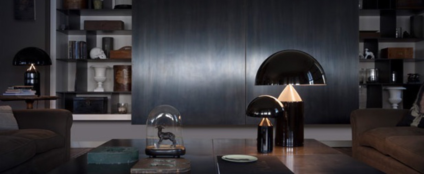 The black Atollo table lamp is designed by Vico Magistretti and published in 1977 by Oluce.