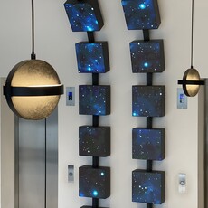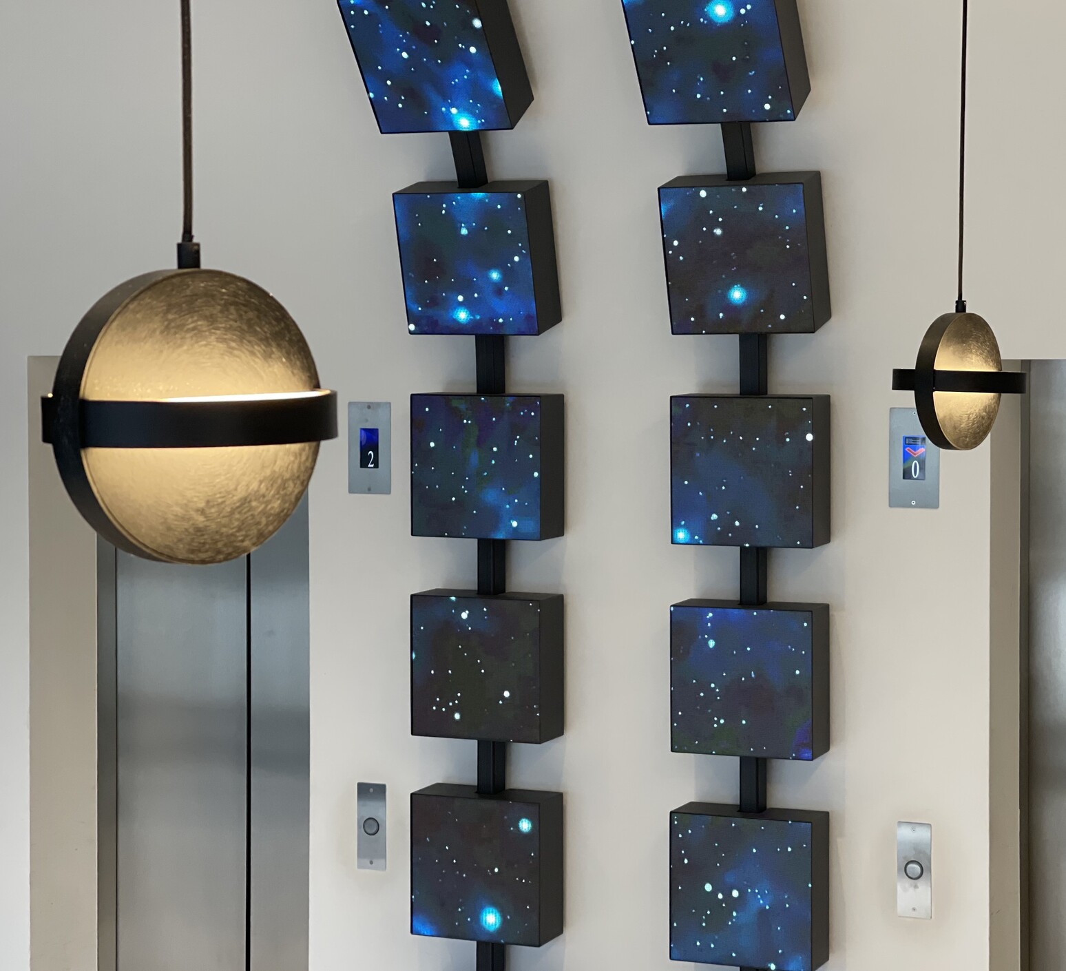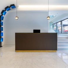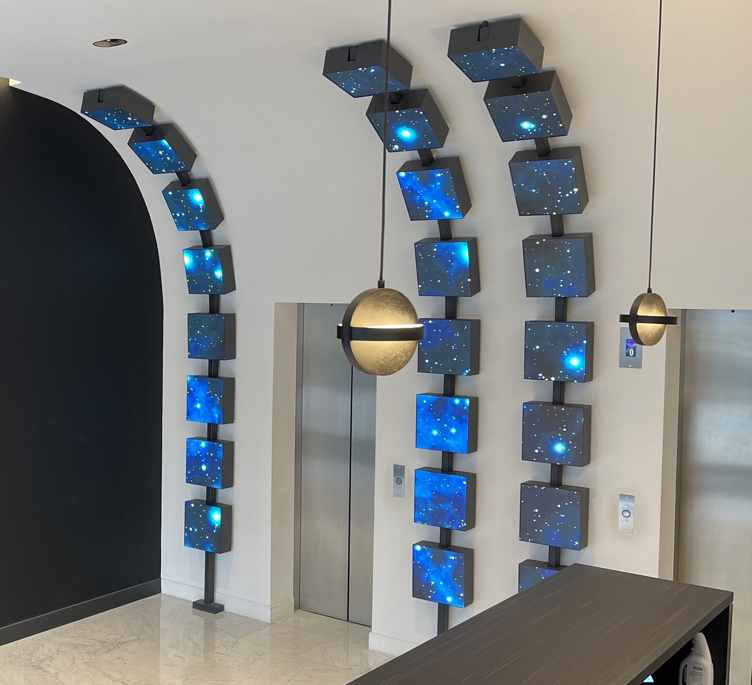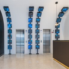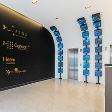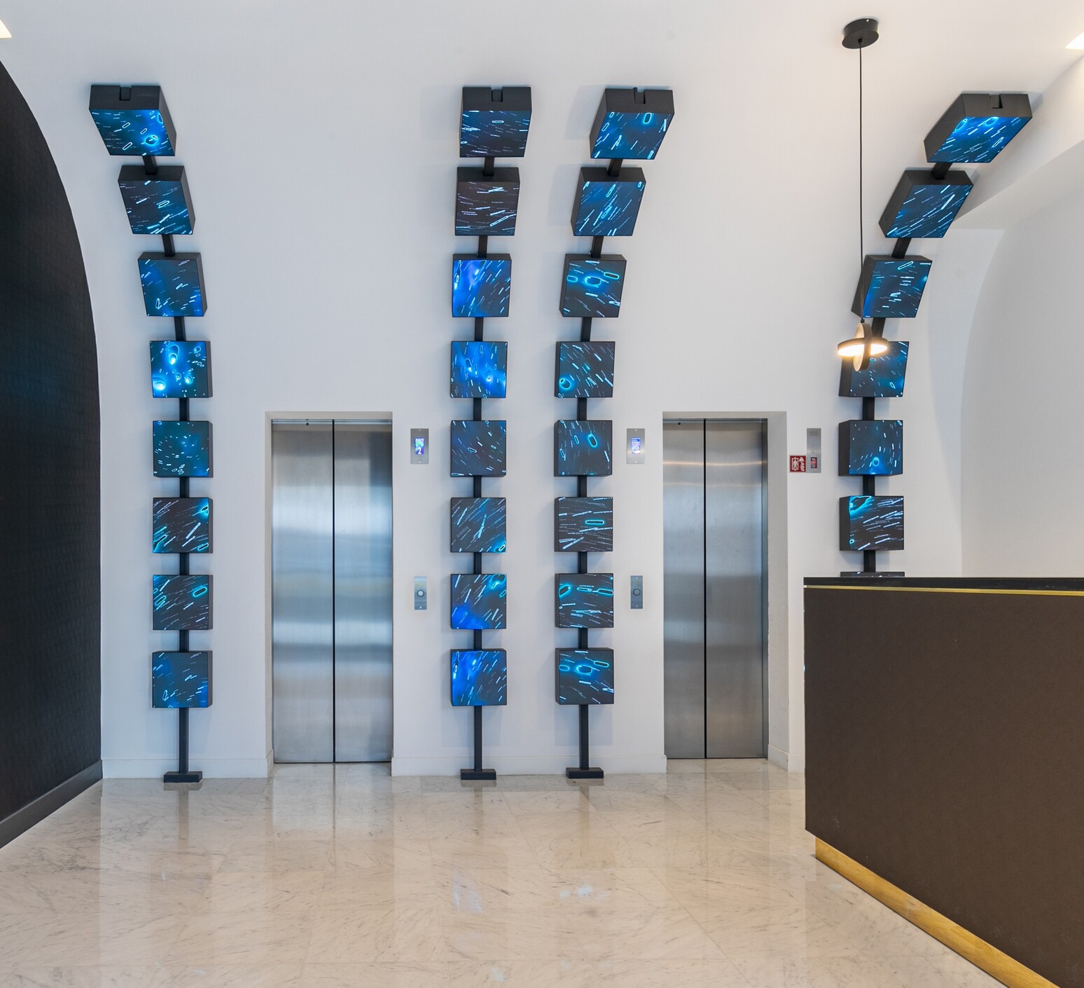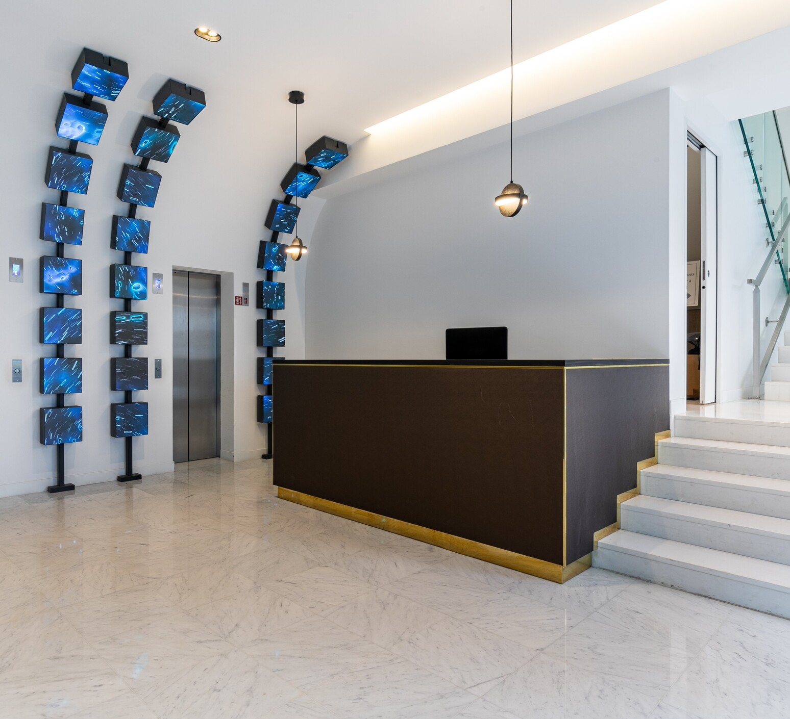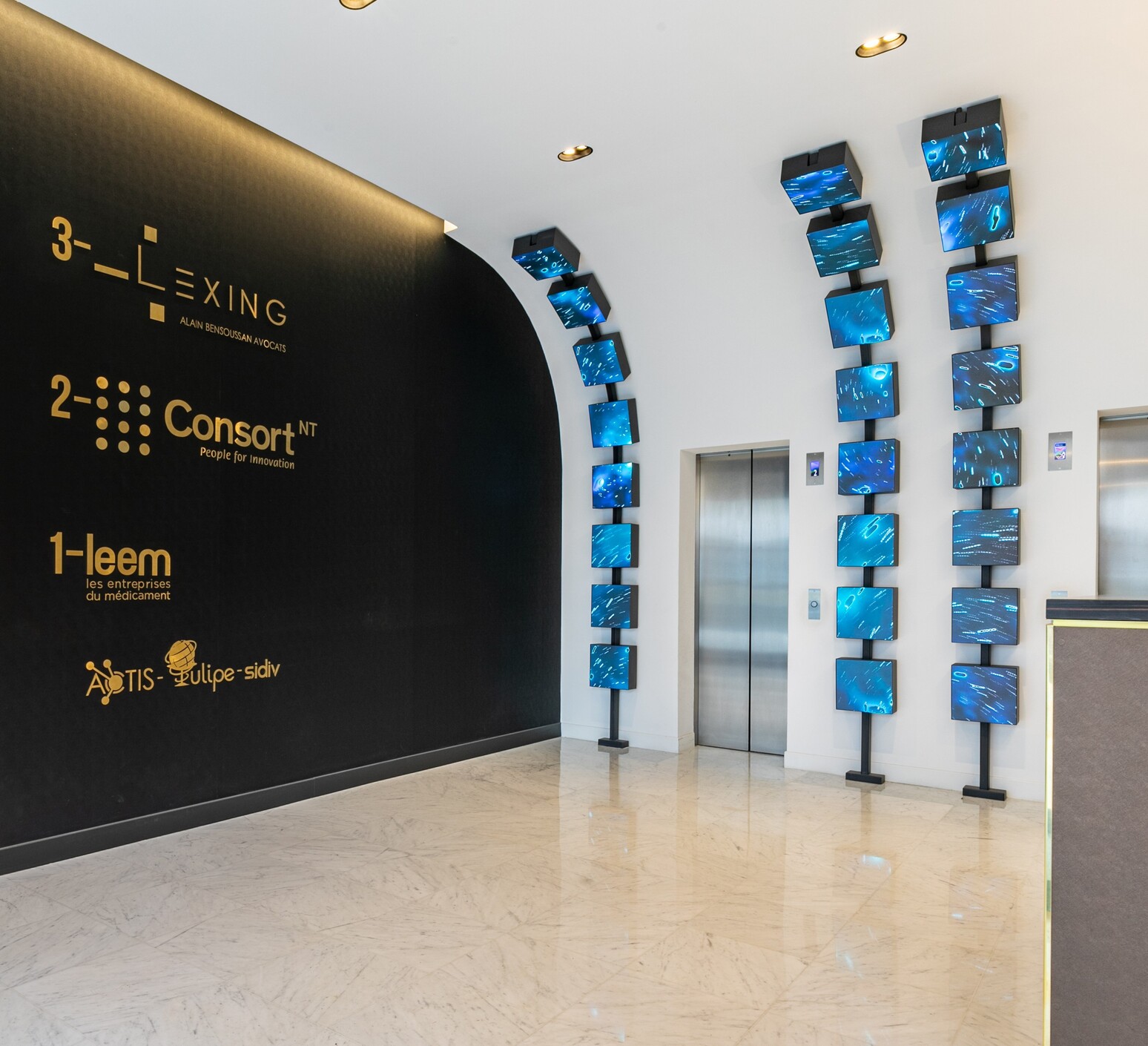 L’éclairage, naturel et artificiel, accentue la perception des volumes. Les grandes baies vitrées de la façade maximisent la lumière du jour, et les reflets sur le marbre, le verre et les cubes LED renforcent la sophistication et l’identité high-tech de l’espace. La circulation est fluide, avec un hall dégagé permettant une orientation claire vers les ascenseurs et les différents étages, et la signalétique stratégique oriente efficacement les visiteurs.