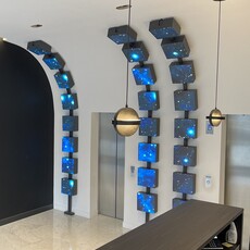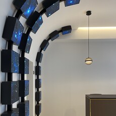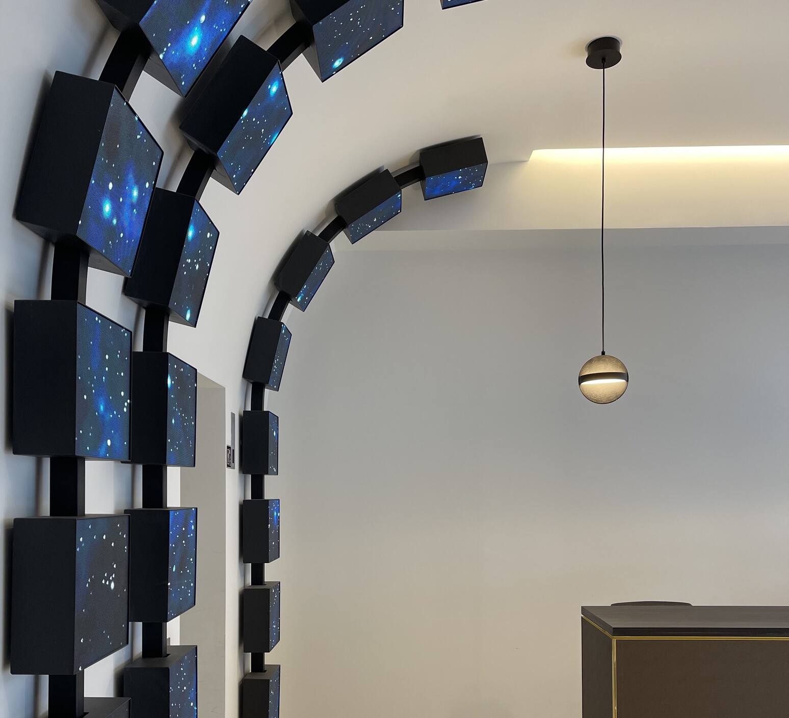 À l’intérieur, le hall d’accueil est conçu comme un espace immersif où lignes épurées, lumières tamisées et éléments technologiques se combinent pour créer une ambiance chaleureuse et professionnelle. Un mur noir mat, orné de logos et d’inscriptions dorées, guide les visiteurs vers les ascenseurs ou se dessinent devant eux un mr ou les écrans se succèdent avec une prouesse technologique remarquable, épousant le mur puis le plafond avec un angle courbe, offrant une expérience visuelle continue et dynamique. Ces cubes cubes lumineux dynamique suspendus en cascade ajoutent une touche futuriste à l’espace. Le comptoir de réception, du même tissus que le mur avec un plateau bois foncé, allie fonctionnalité et élégance.