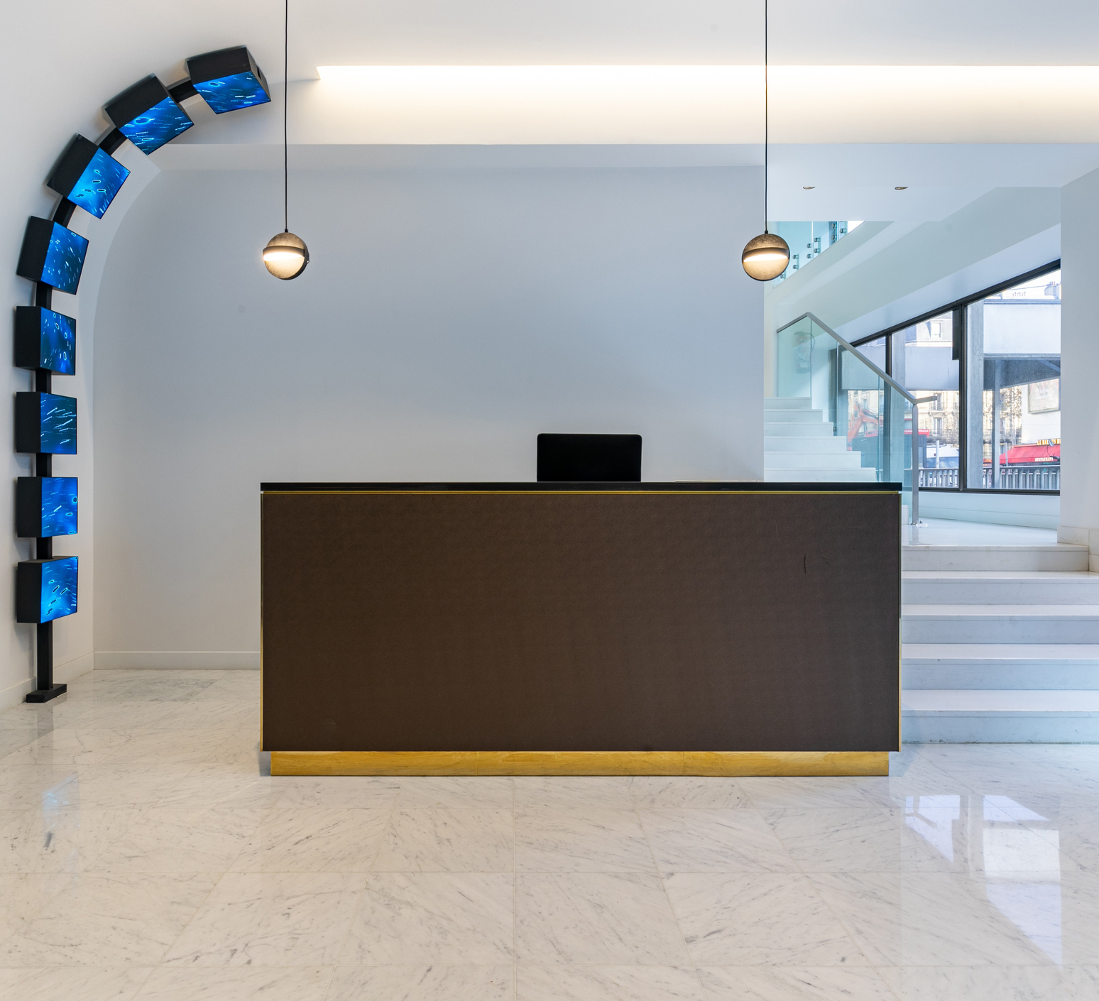 Concevoir un projet contemporain, high-tech et adapté à trois entreprises aux activités très différentes – un cabinet d’avocats, un cabinet informatique et un cabinet pharmaceutique – constituait un cahier des charges exigeant. La mise en place d’écrans s’est rapidement imposée comme une évidence, mais la question de leur emplacement, de leur angle et de leur projection restait un défi.