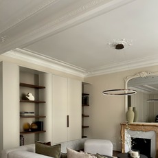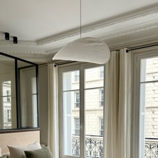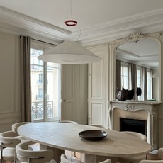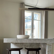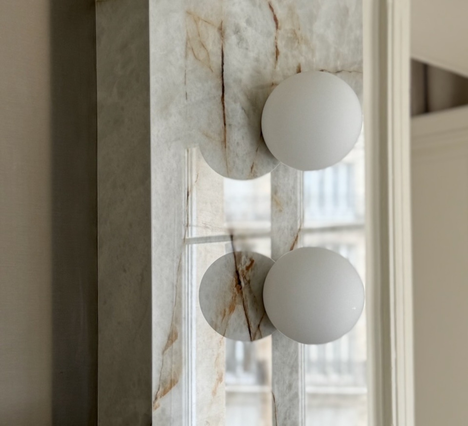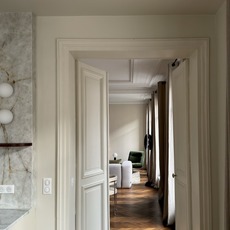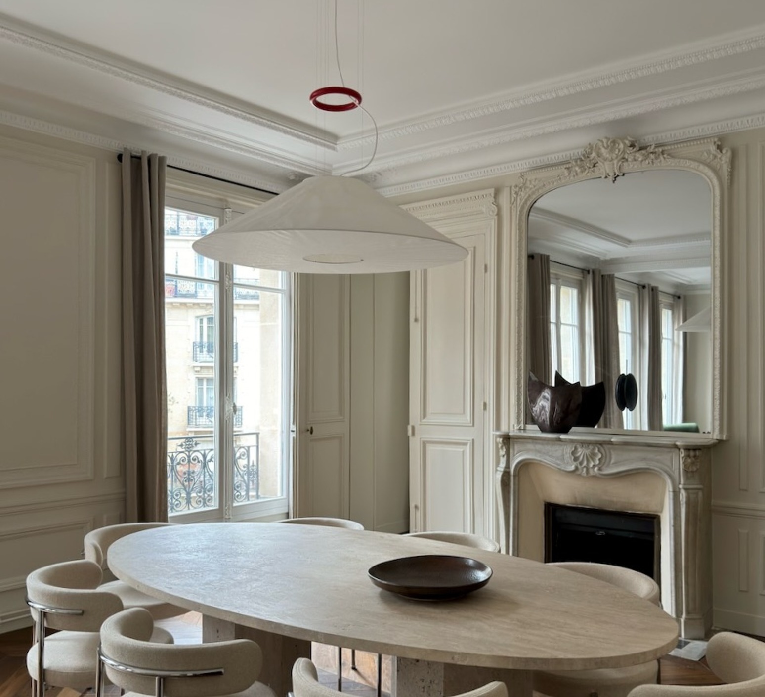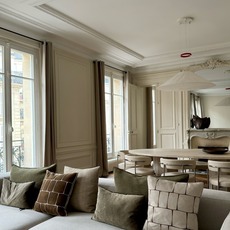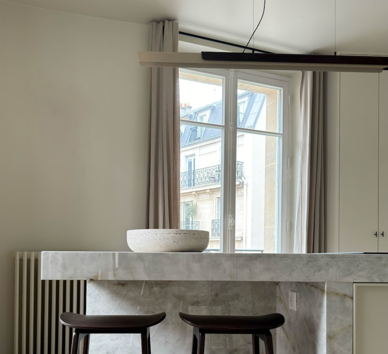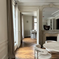 Dans ce grand appartement haussmannien du 9ᵉ arrondissement, les volumes ont été réorganisés et l’ensemble modernisé tout en préservant le caractère du lieu. Moulures, parquets en point de Hongrie et cheminées d’origine dialoguent avec des matières nobles et intemporelles : marbre veiné, travertin, bois foncé, inox et textiles précieux.