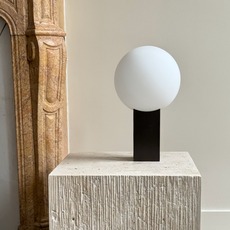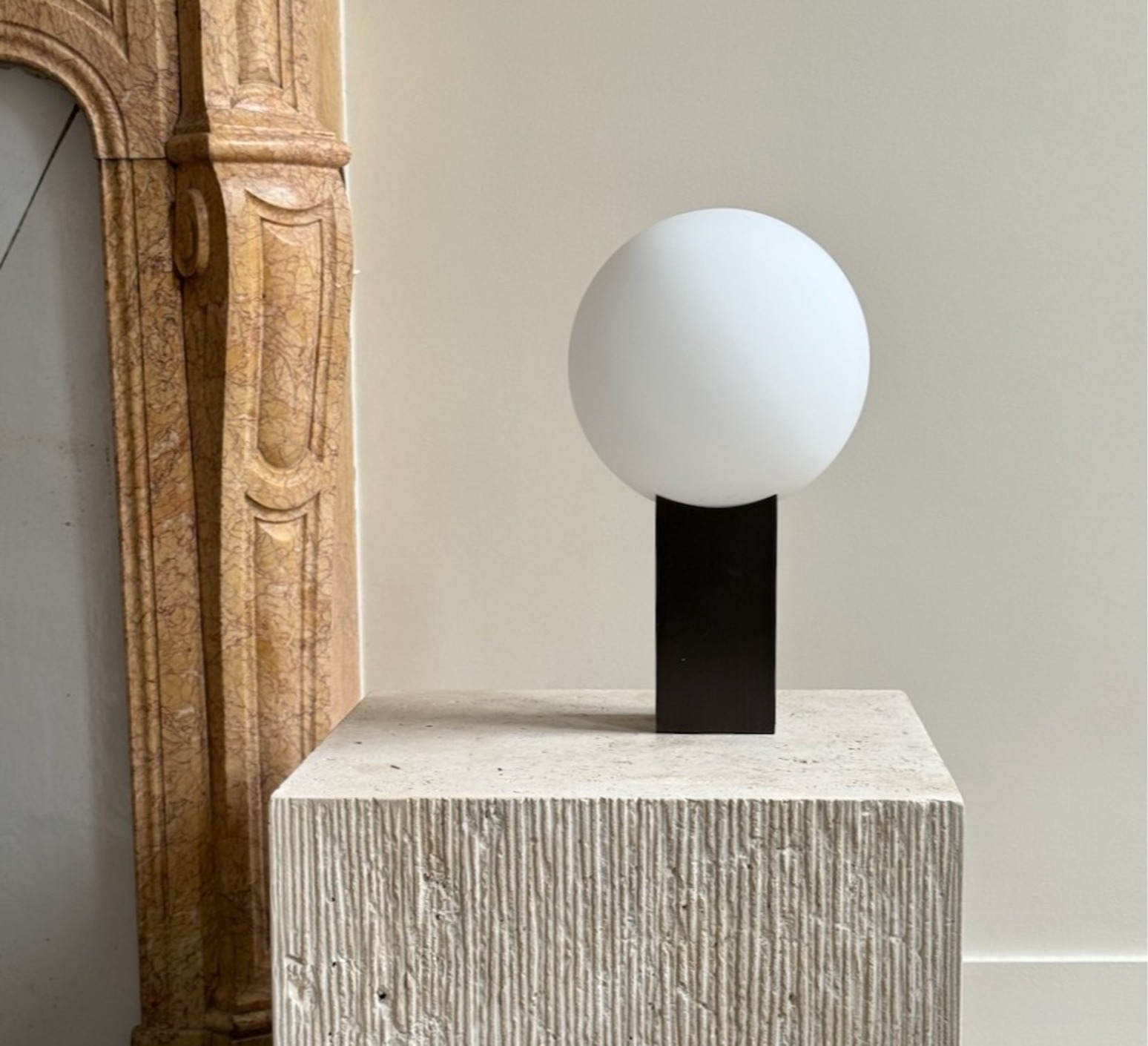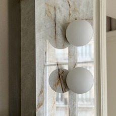 Dans la suite parentale, les codes de l’haussmannien sont mis en valeur par une écriture plus contemporaine. La tête de lit graphique en travertin et bois massif habille la pièce et s’appuie sur une verrière discrète qui dissimule une salle d’eau en béton ciré, épurée et lumineuse.