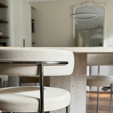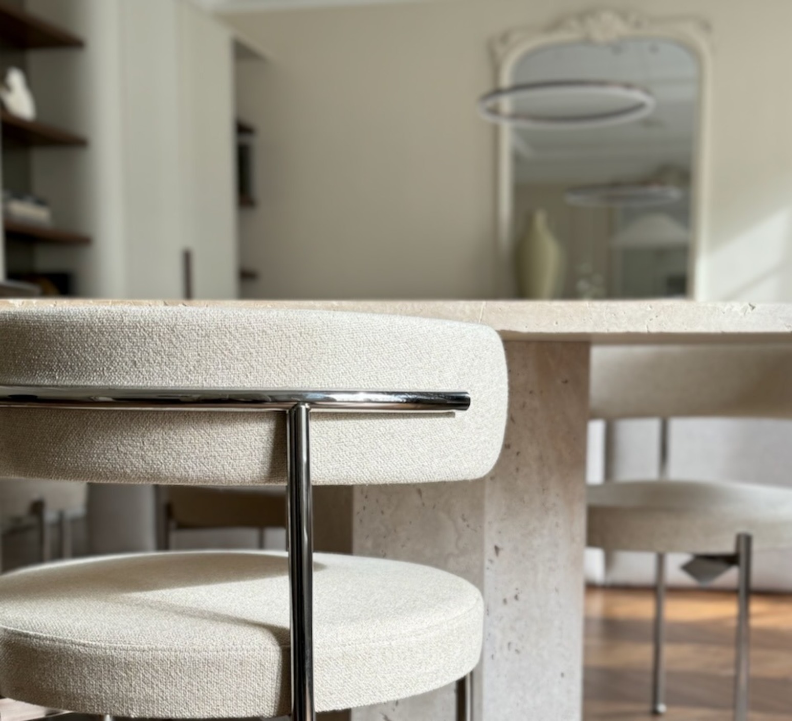 La pièce de réception se déploie dans une grande enfilade lumineuse. L’espace repas s’organise autour d’une table massive en travertin, mise en valeur par une suspension sculpturale qui signe l’ensemble. Le salon, quant à lui, se structure autour d’un meuble bibliothèque, véritable pièce signature. Les textiles, choisis dans une gamme d’ocres et de verts, apportent une dimension chaleureuse et adoucissent la rigueur des lignes.