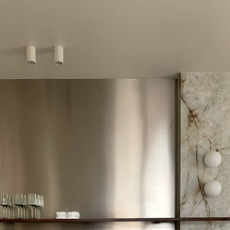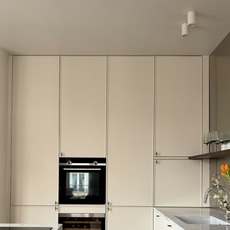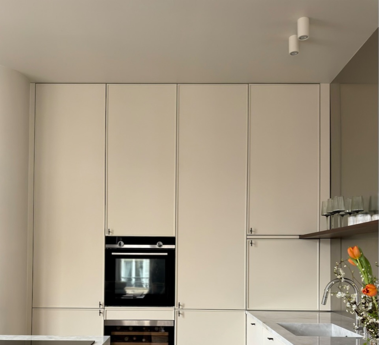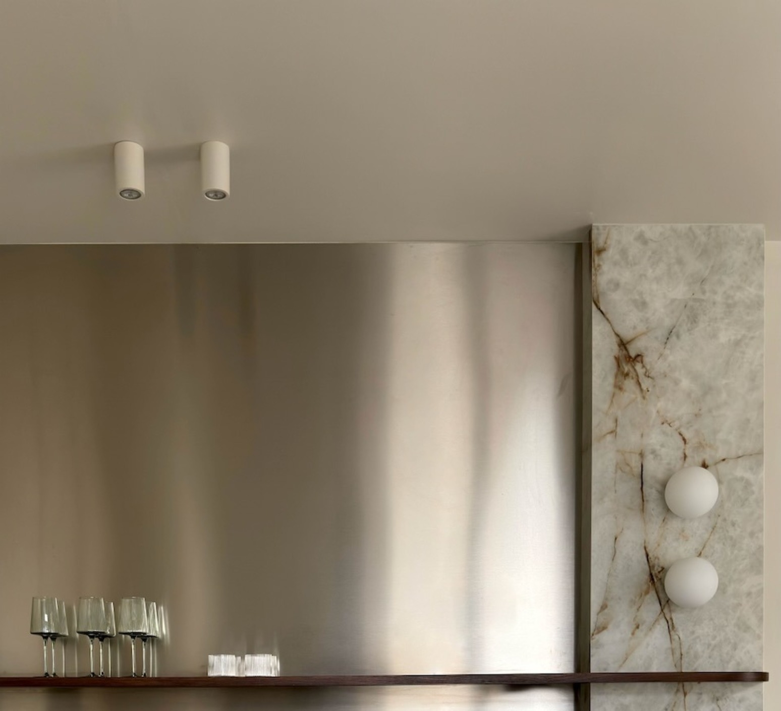La cuisine s’articule autour d’un îlot en marbre, élément central qui structure l’espace. La crédence XXL en inox apporte une touche résolument moderne tandis que les rangements conçus sur mesure épousent les volumes sans rompre la sobriété du lieu.