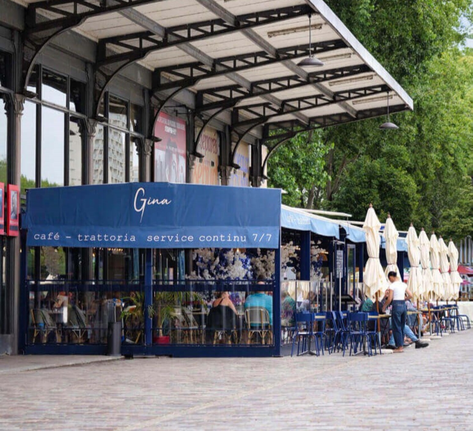 Le mobilier sur mesure, conçu par notre Studio, joue un rôle central dans le concept architectural. Les tables en forme de pétale ont été dessinées, fabriquées et distribuées par notre Studio. Les chaises, réalisées par Les Gambettes, bénéficient de finitions développées sur mesure. Dans une démarche d’éco-conception, les banquettes existantes ont été transformées et retapissées par une tapissière parisienne avec un tissu inspiré du design italien d’antan.