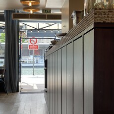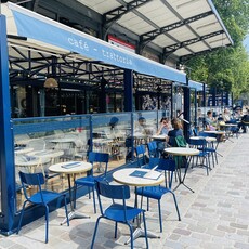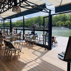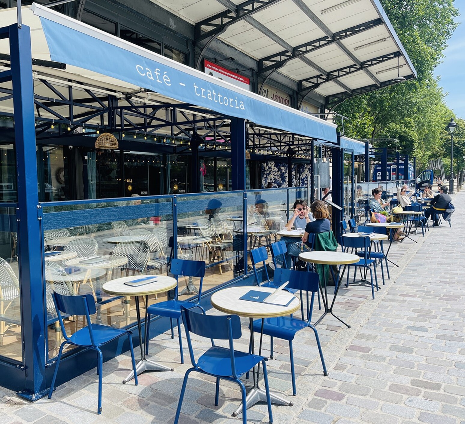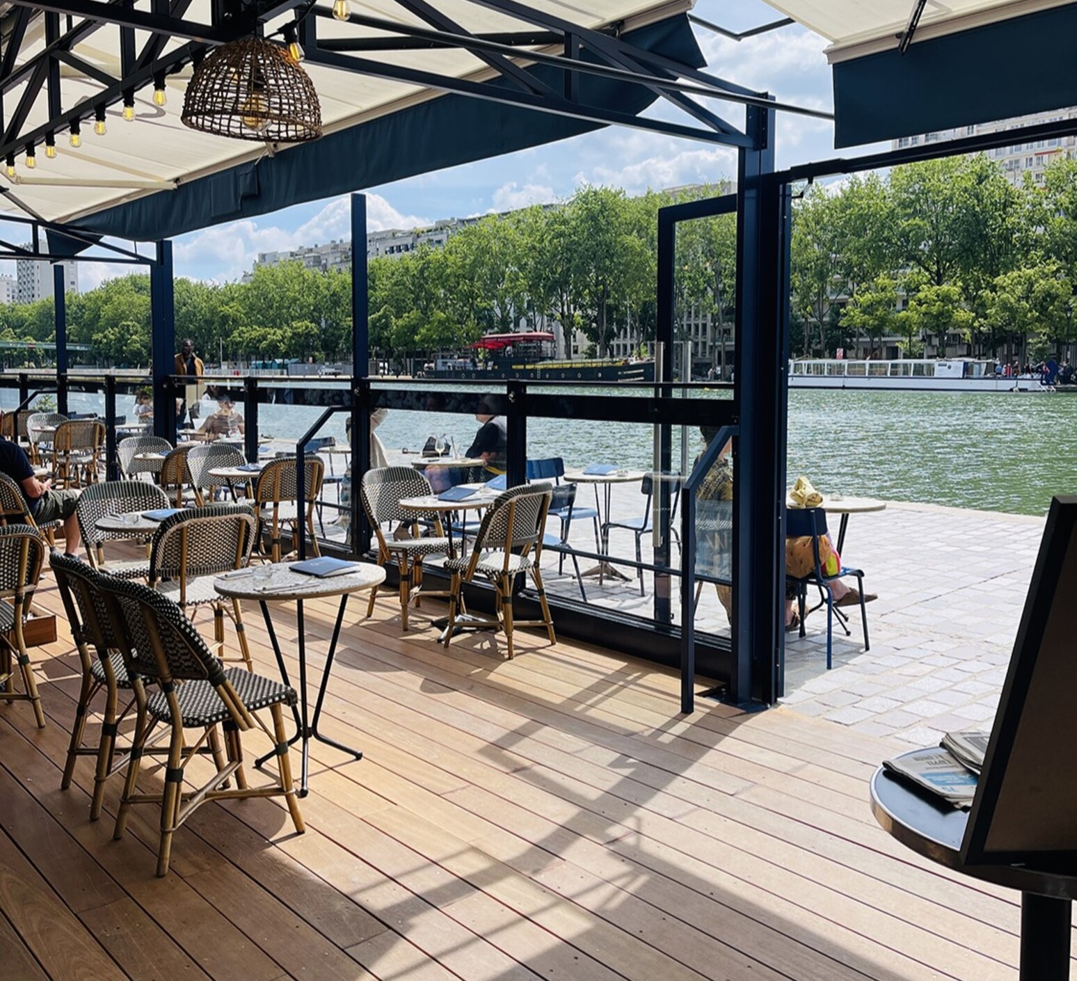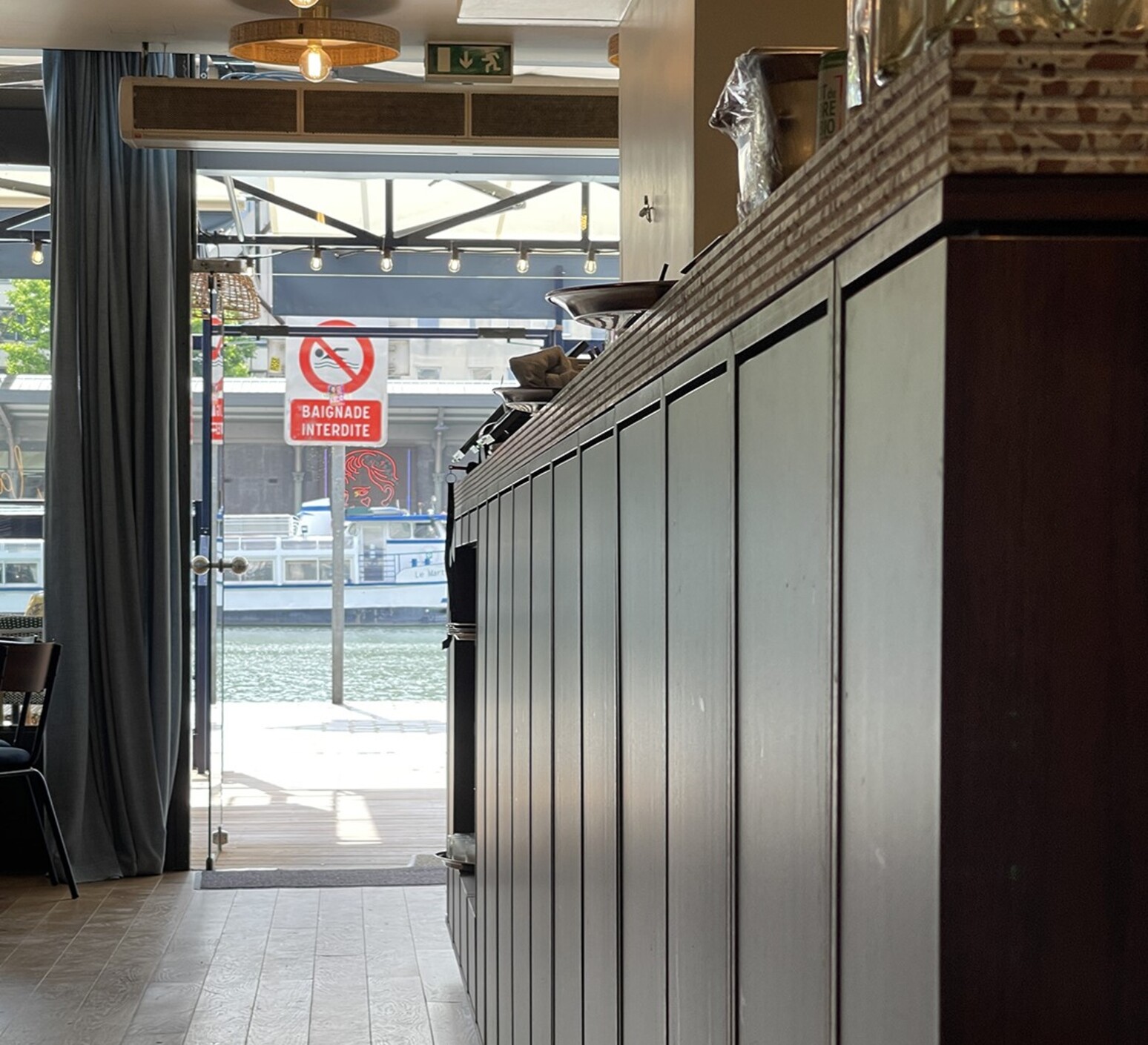 Le bar, élément structurant du projet, a été conçu en panneaux WallWood finition noyer, réalisés dans nos ateliers en France, avec une finition spécialement développée pour ce lieu. La terrasse a été agrandie et équipée d’une nouvelle structure permettant l’ouverture totale des baies vitrées, créant une continuité naturelle entre intérieur et extérieur.
