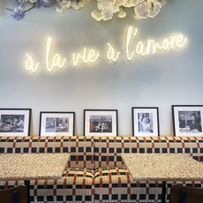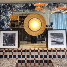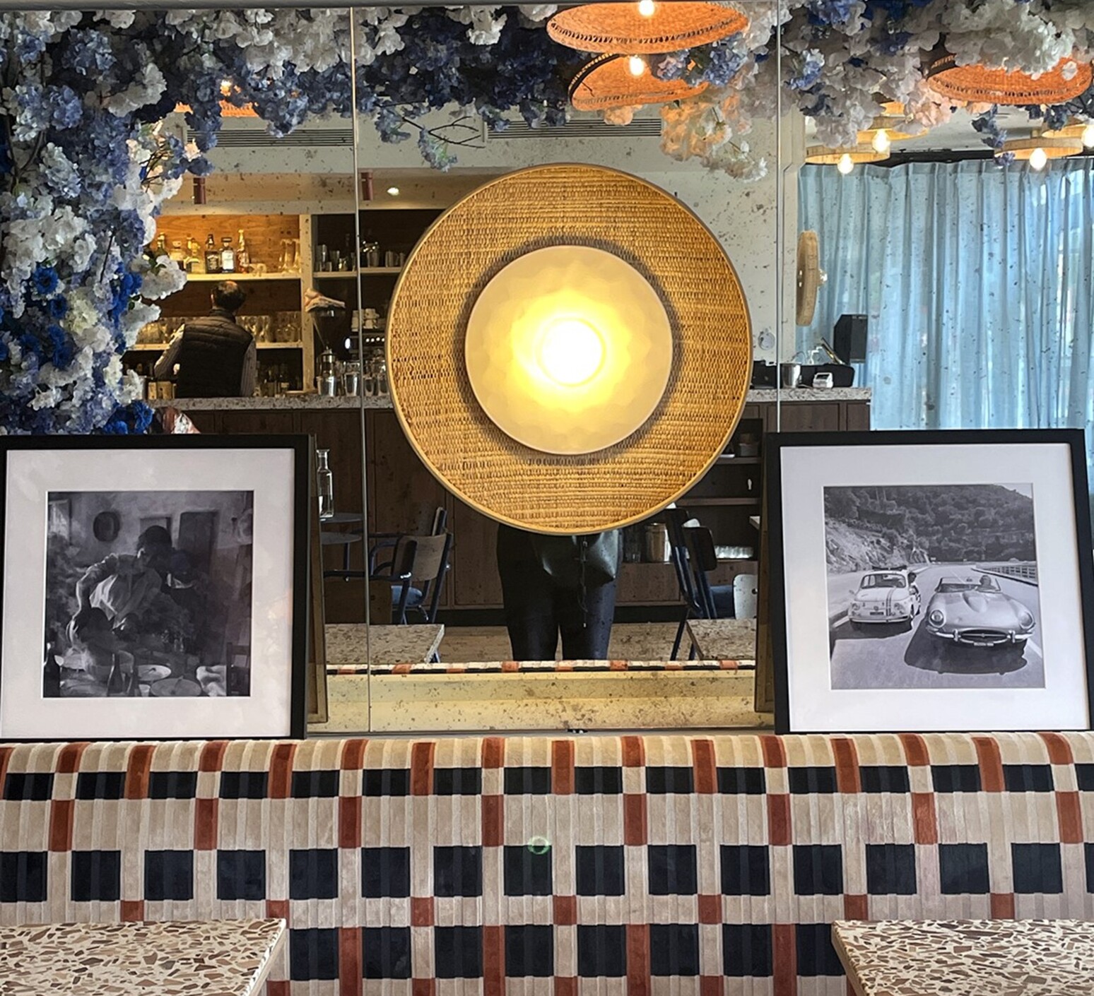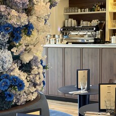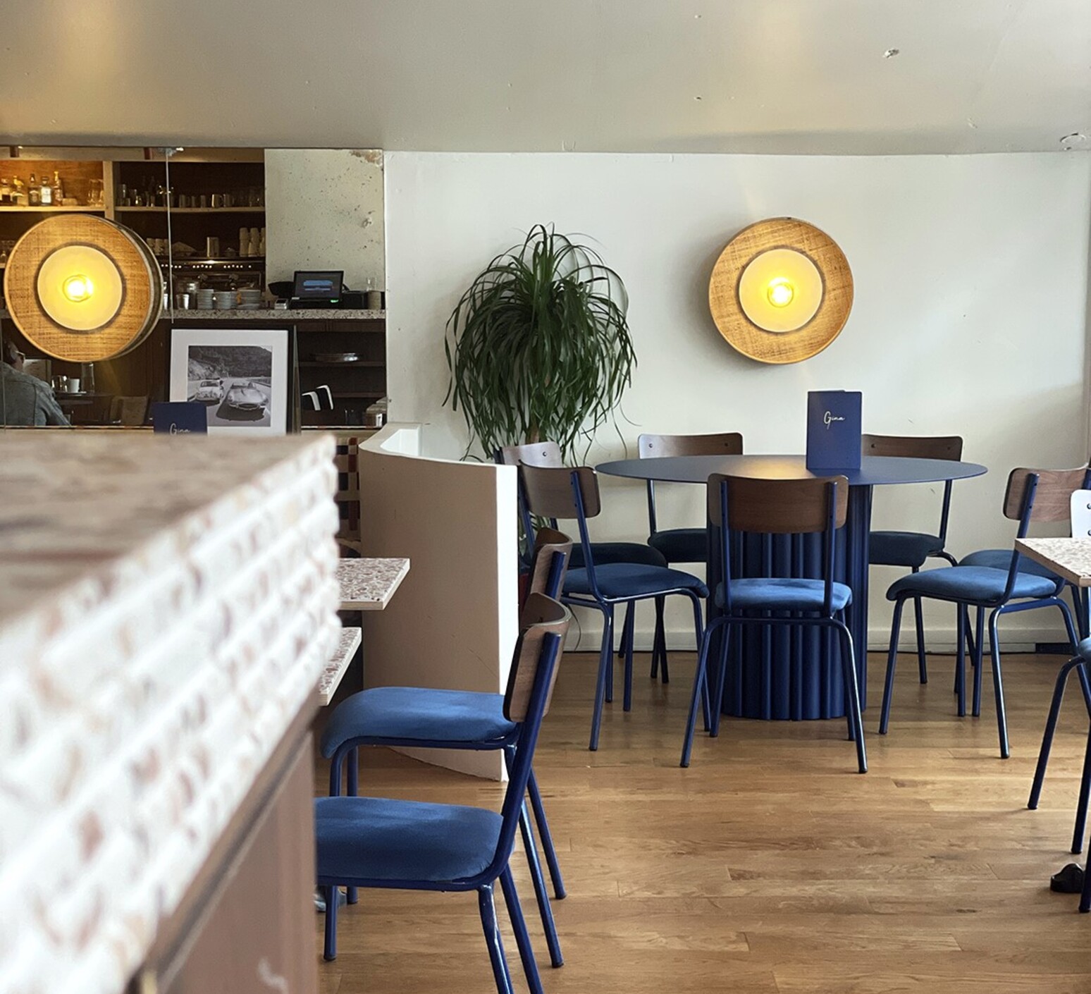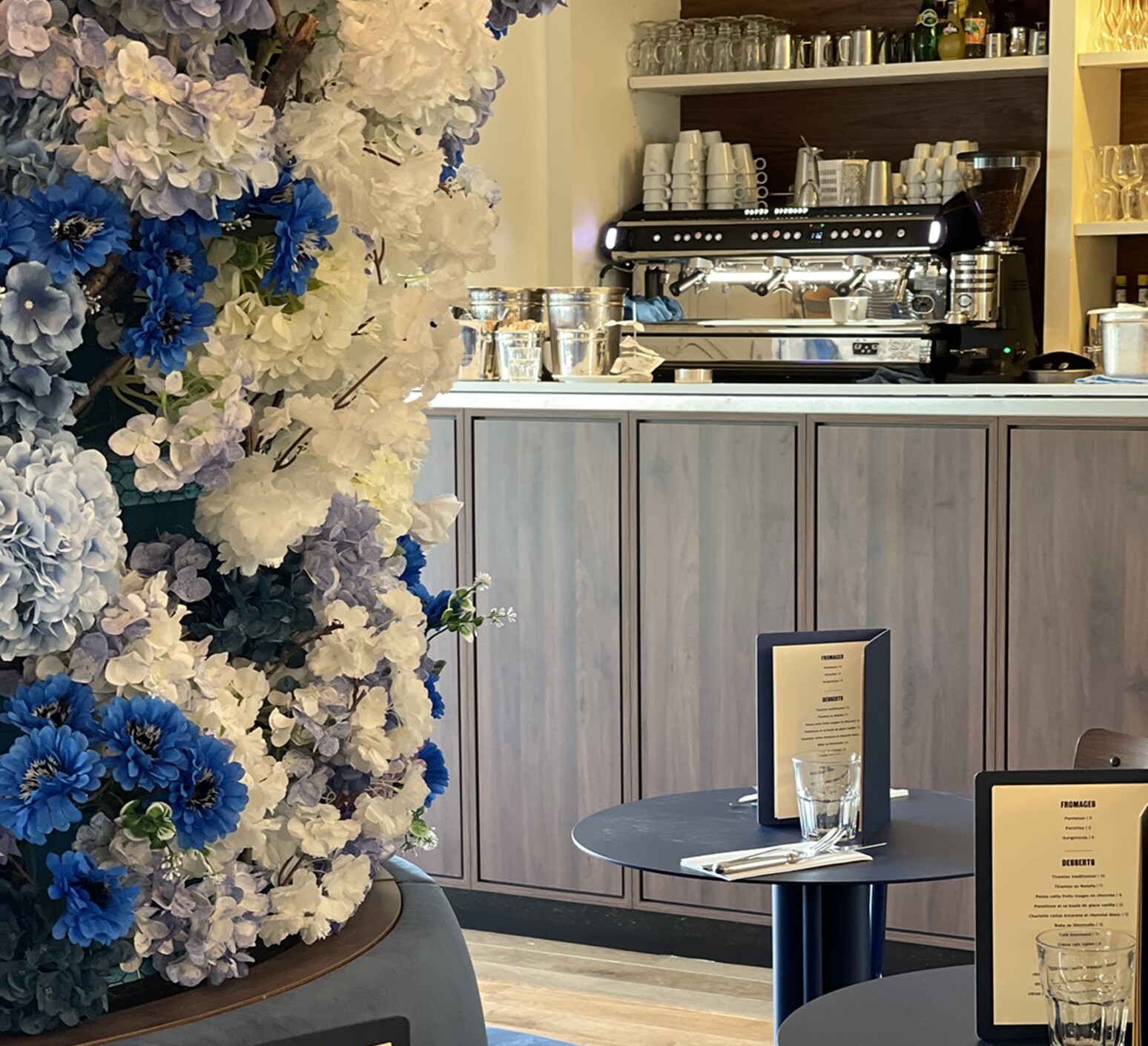 L’espace s’organise autour d’un fût central d’où s’élance une composition florale architecturale, structurant le volume tout en dissimulant les éléments techniques du plafond. Inspiré d’un patio grec intérieur, l’aménagement circulaire favorise la convivialité et donne une lecture fluide de l’espace. Le bleu Klein, fil conducteur du projet, ponctue l’ensemble à travers le mobilier et affirme l’identité du lieu.