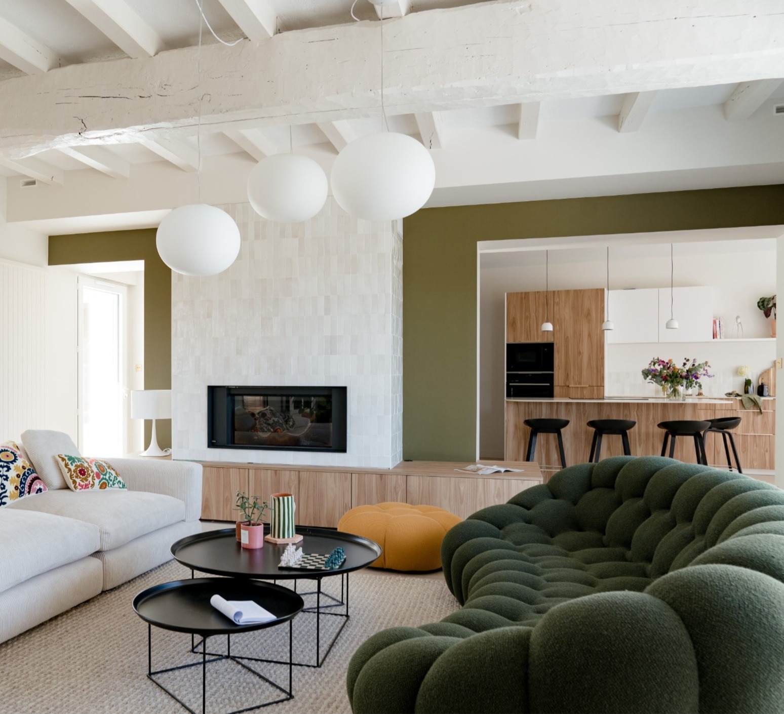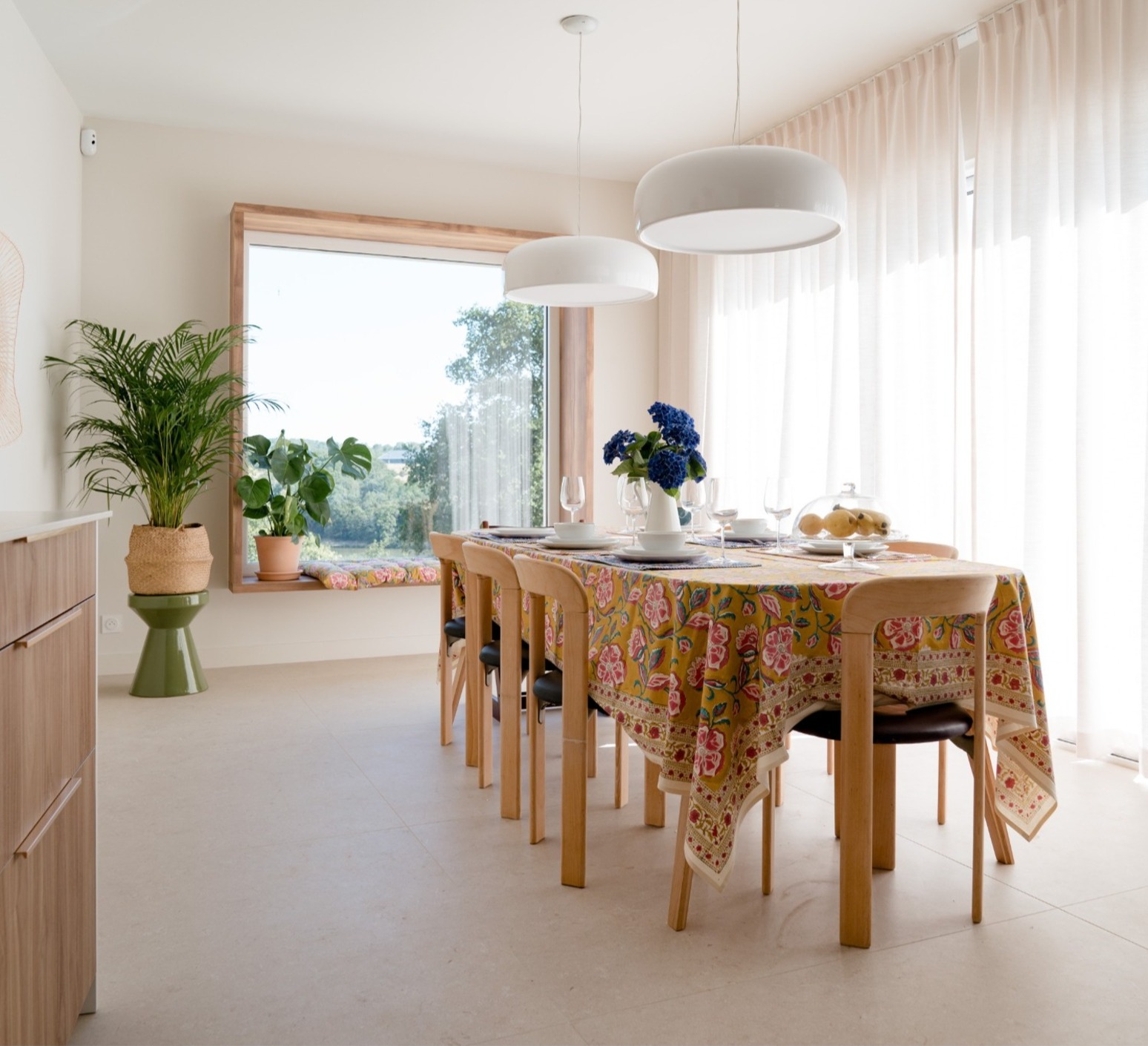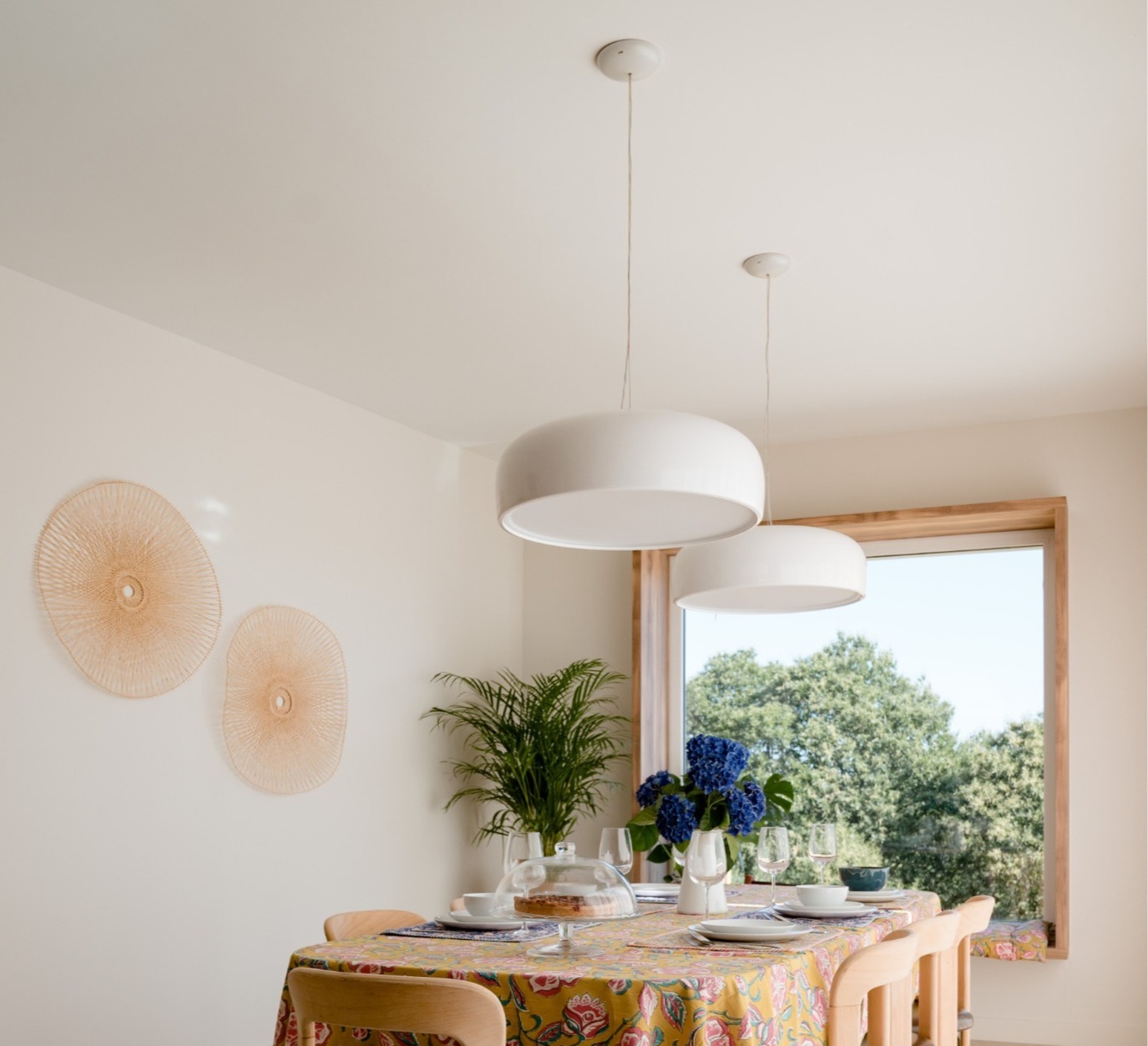 Im Inneren vereint die Dekoration den rustikalen Charme der Holzbalken mit zeitgenössischen Akzenten: sanfte Farben, Designerleuchten, natürliche Materialien und maßgefertigte Möbel. Die zugleich funktionale und ästhetische Einrichtung bevorzugt klare Linien und warme Materialien und schafft so ein gemütliches und raffiniertes Interieur. Eine Renovierung, die diesem bretonischen Haus zwischen Tradition und Moderne ein zweites Leben verleiht.