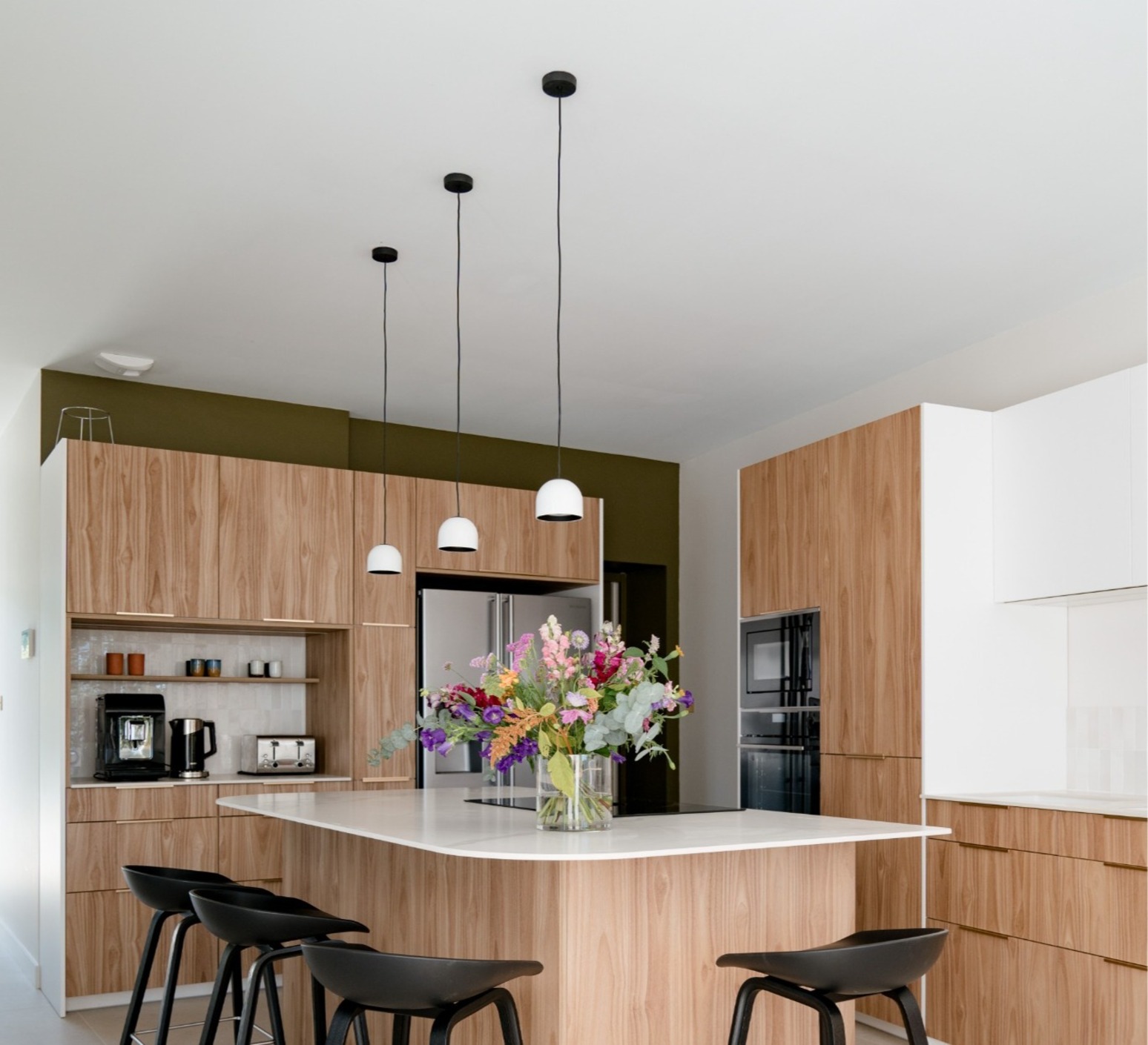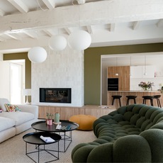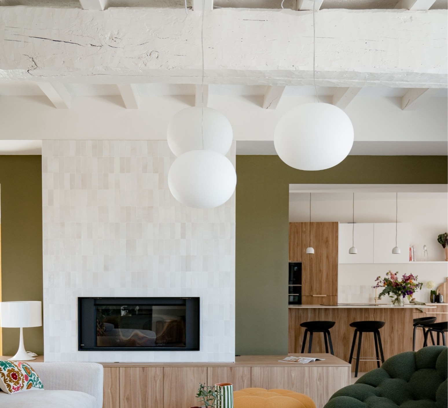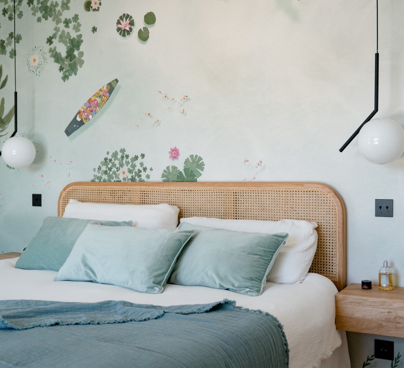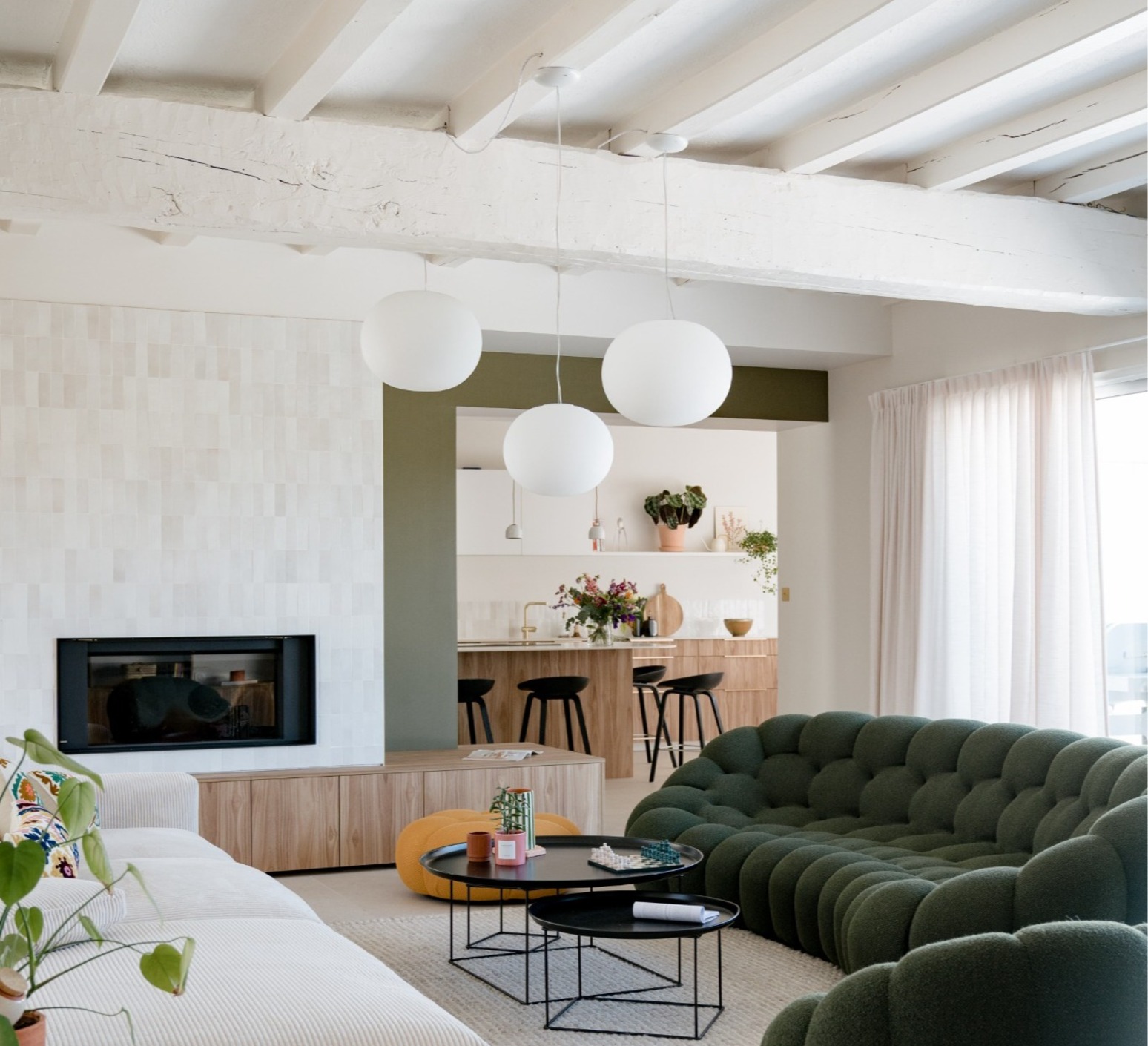 Im Inneren vereint die Dekoration den rustikalen Charme der Holzbalken mit zeitgenössischen Akzenten: sanfte Farben, Designerleuchten, natürliche Materialien und maßgefertigte Möbel. Die zugleich funktionale und ästhetische Einrichtung bevorzugt klare Linien und warme Materialien und schafft so ein gemütliches und raffiniertes Interieur. Eine Renovierung, die diesem bretonischen Haus zwischen Tradition und Moderne ein zweites Leben verleiht.