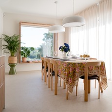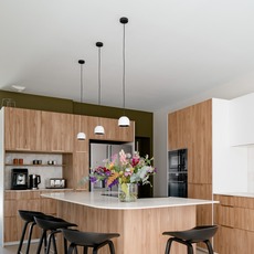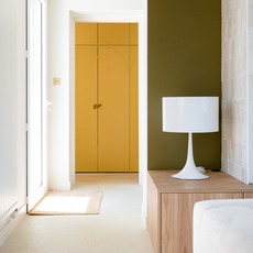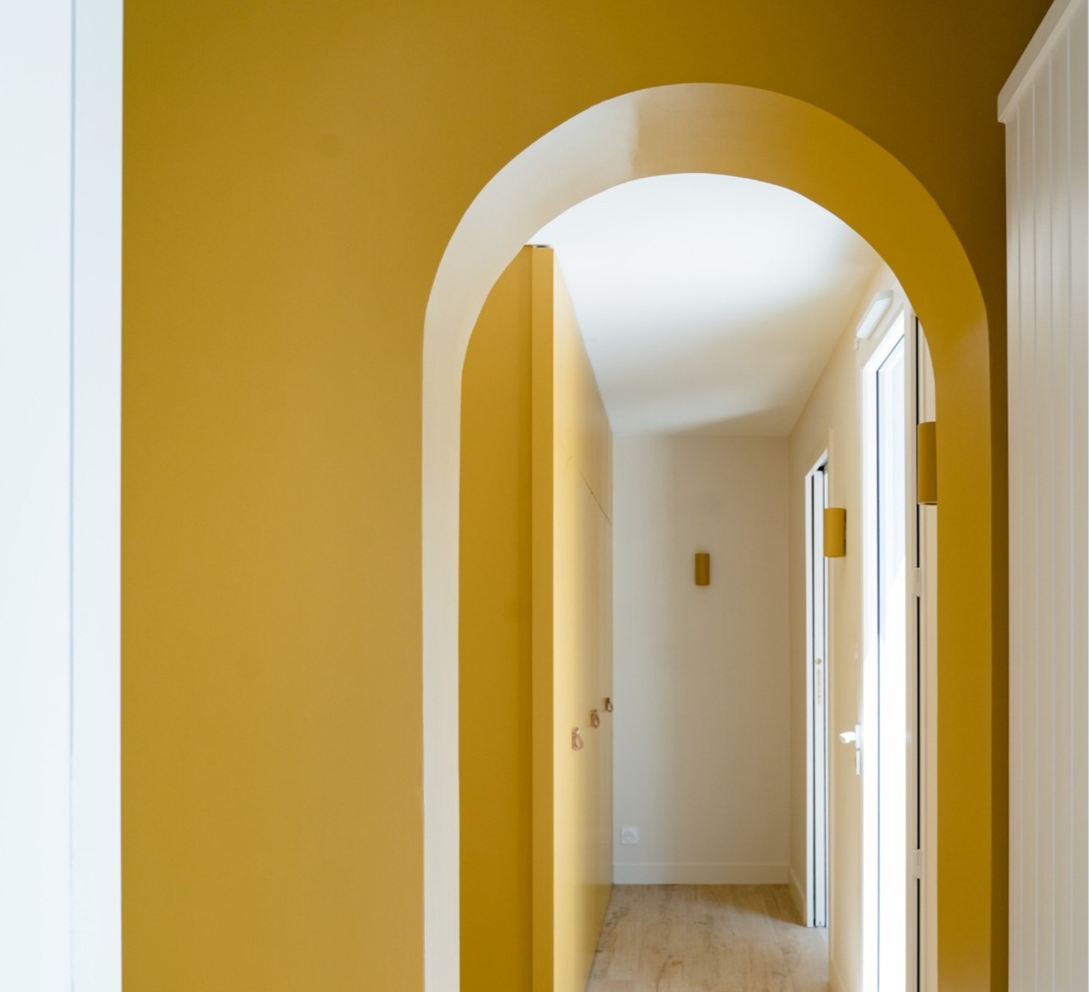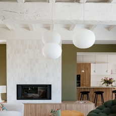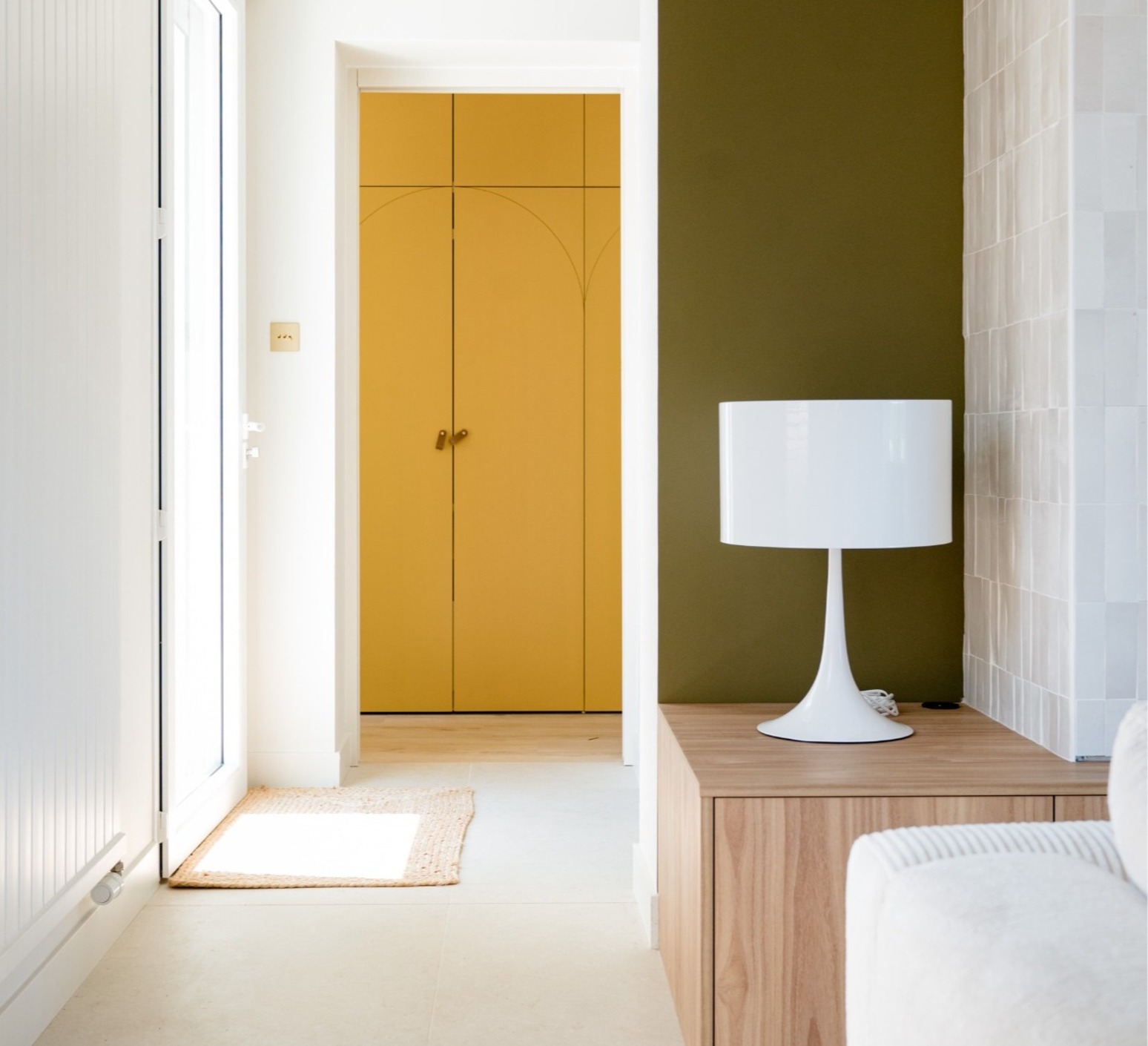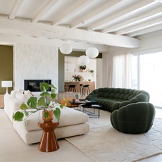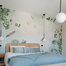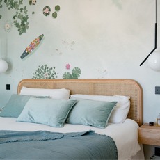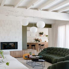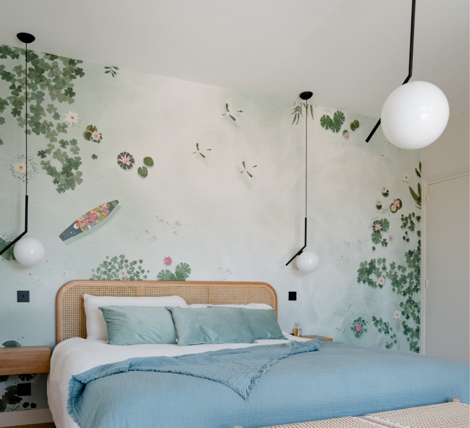 Im Inneren vereint die Dekoration den rustikalen Charme der Holzbalken mit zeitgenössischen Akzenten: sanfte Farben, Designerleuchten, natürliche Materialien und maßgefertigte Möbel. Die zugleich funktionale und ästhetische Einrichtung bevorzugt klare Linien und warme Materialien und schafft so ein gemütliches und raffiniertes Interieur. Eine Renovierung, die diesem bretonischen Haus zwischen Tradition und Moderne ein zweites Leben verleiht.