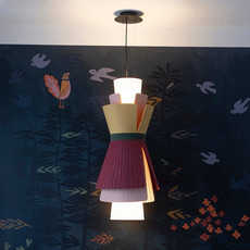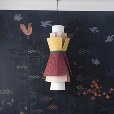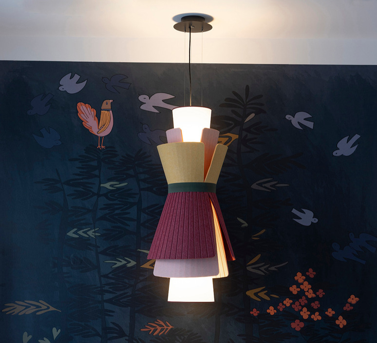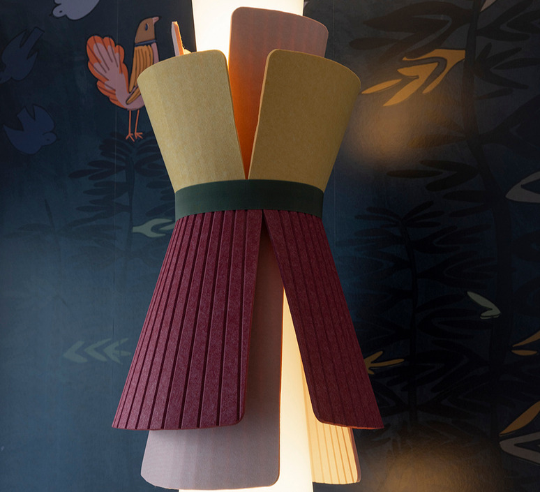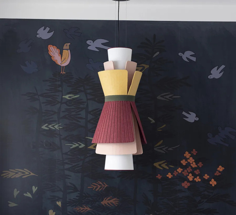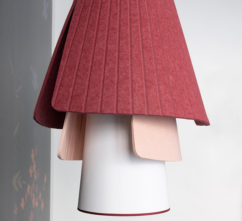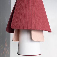 Mit ihren farbigen Stoffüberwürfen - Sonnengelb, Granatrot, Hellrosa - nimmt die Rhapsodie eine zylindrische Silhouette mit einem ausgeprägten grafischen Stil an. Sie eignet sich sowohl für Geschäfts- als auch für Wohnräume und schafft eine sanfte, gedämpfte Atmosphäre, während sie dank ihrer akustischen Eigenschaften Lärmbelästigungen absorbiert. Über einem Konferenztisch oder in einer Lobby aufgehängt, trägt sie zu einer ruhigen und eleganten Atmosphäre bei.