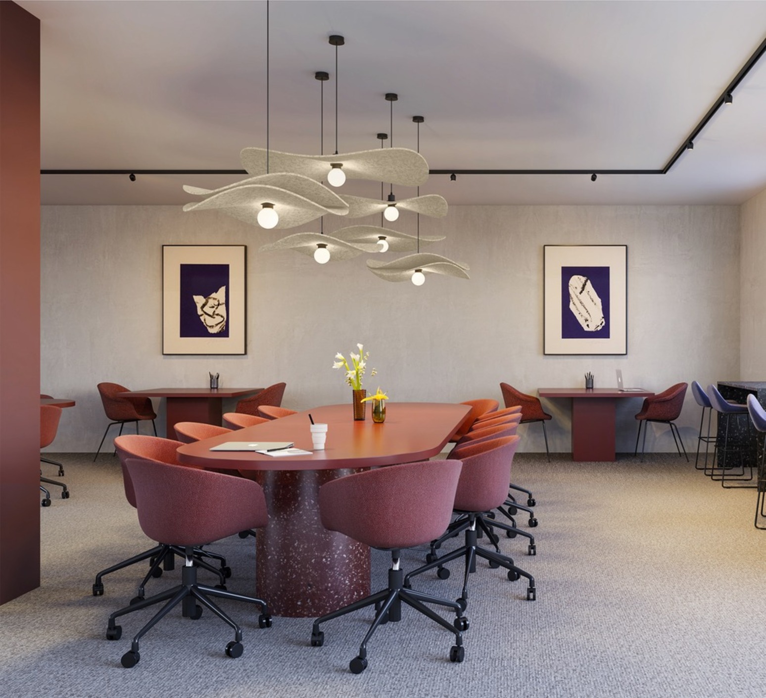 Mit einem Lampenschirm aus akustischem Filz kombiniert sie direkte Beleuchtung mit effektiver Lärmreduzierung, um eine ruhigere und komfortablere Atmosphäre zu schaffen. Ihr Design sorgt für eine warme visuelle Dimension.