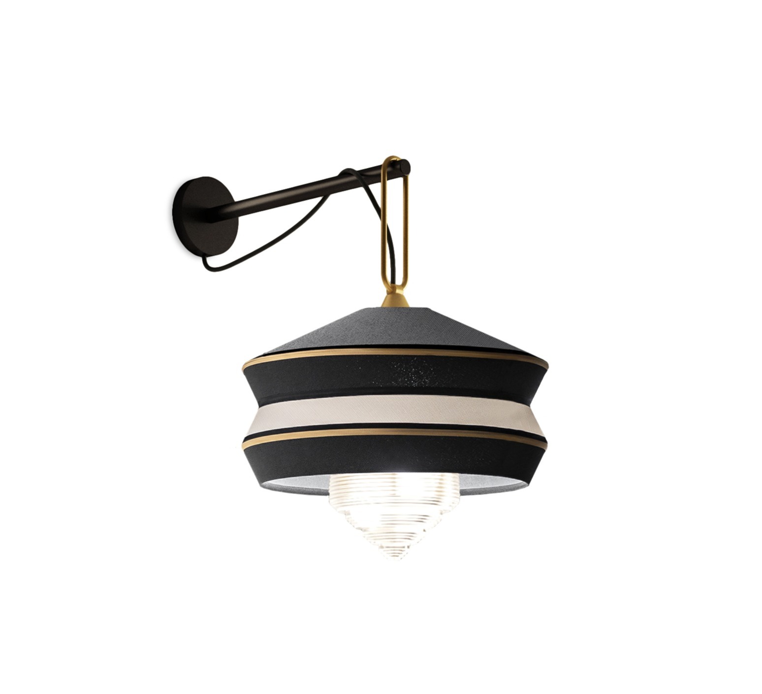 Die Wandleuchte kombiniert ein anspruchsvolles, matt lackiertes schwarzes Metallgestell mit einem Ring aus satiniertem Messing, der den Stoffschirm und einen Diffusor aus transparentem Glas trägt und der Leuchte ein elegantes und zugleich ausdrucksstarkes Aussehen verleiht. Der Lampenschirm hat einen Durchmesser von 36 cm und bietet Platz für eine 14W E27-Glühbirne.