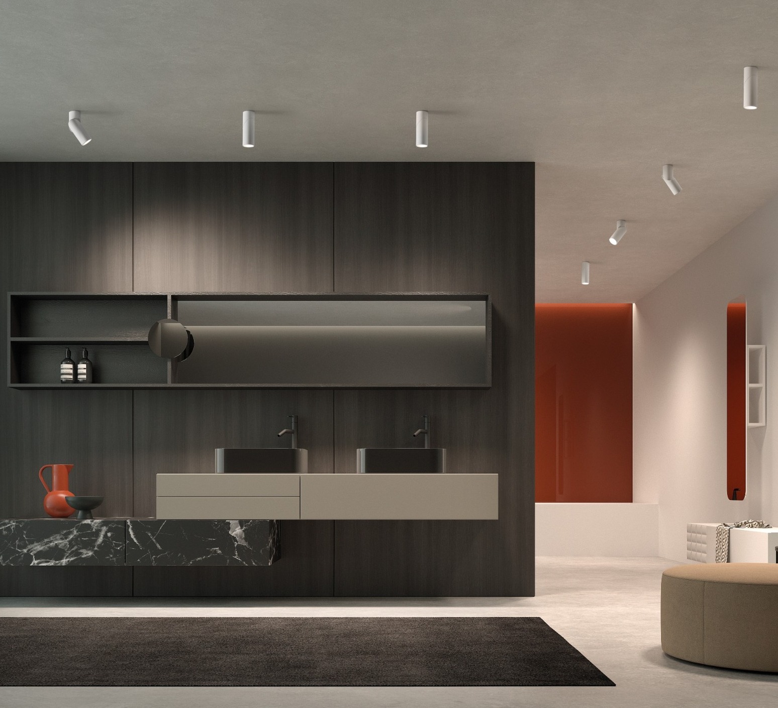 Sie ist aus Metall mit einer mattweißen Oberfläche gefertigt und verkörpert den architektonischen Stil der Kollektion durch ein diskretes und zugleich selbstbewusstes Design.