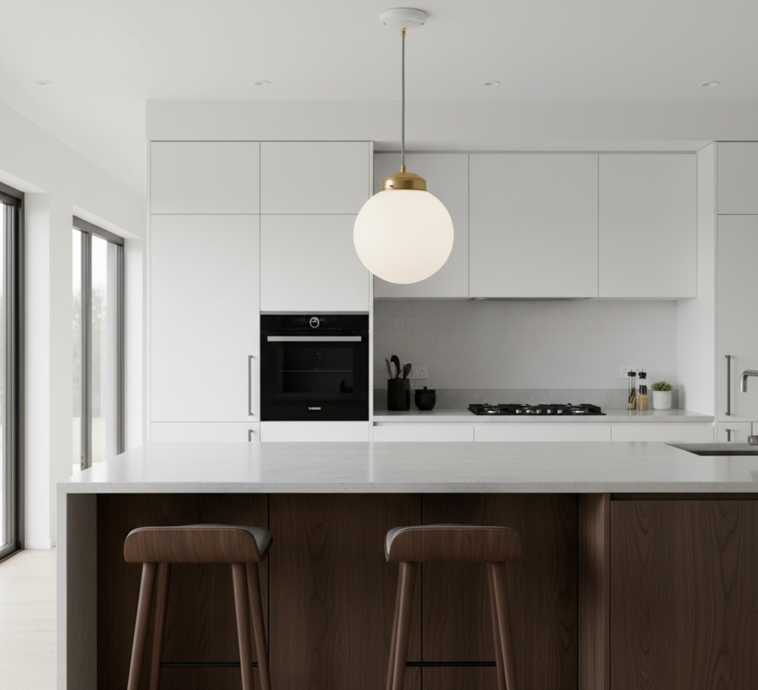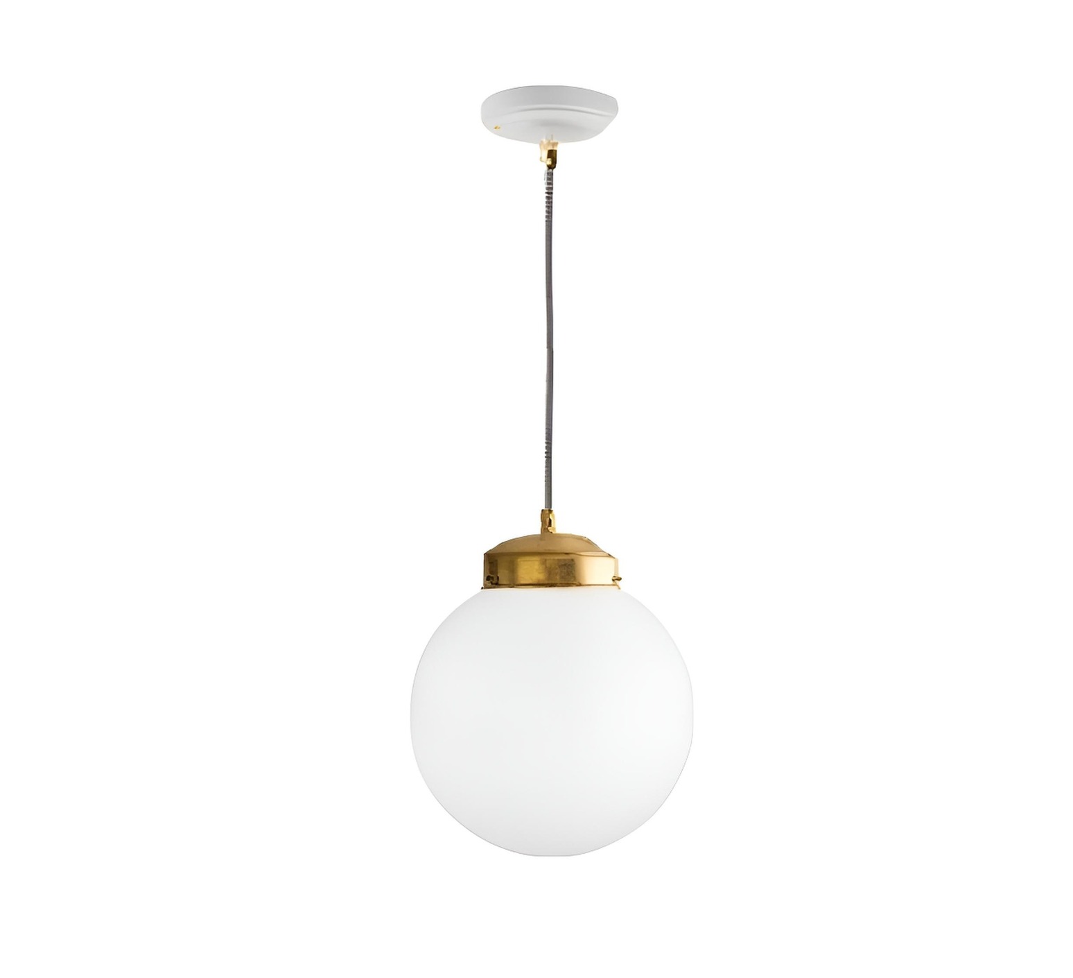 Die Kuppel aus Opalglas, die sanft unter einer vergoldeten Messingkappe liegt, verbreitet ein warmes, umhüllendes Licht, während das Textilkabel eine elegante Retro-Note hinzufügt.