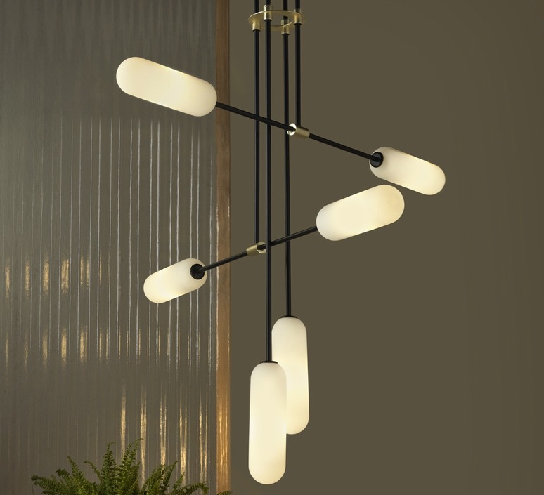 Sie ist modern und skulptural und vereint eine Stahlstruktur, einen Diffusor aus mundgeblasenem Opalglas und eine leichte, aber raffinierte Komposition.