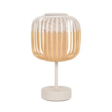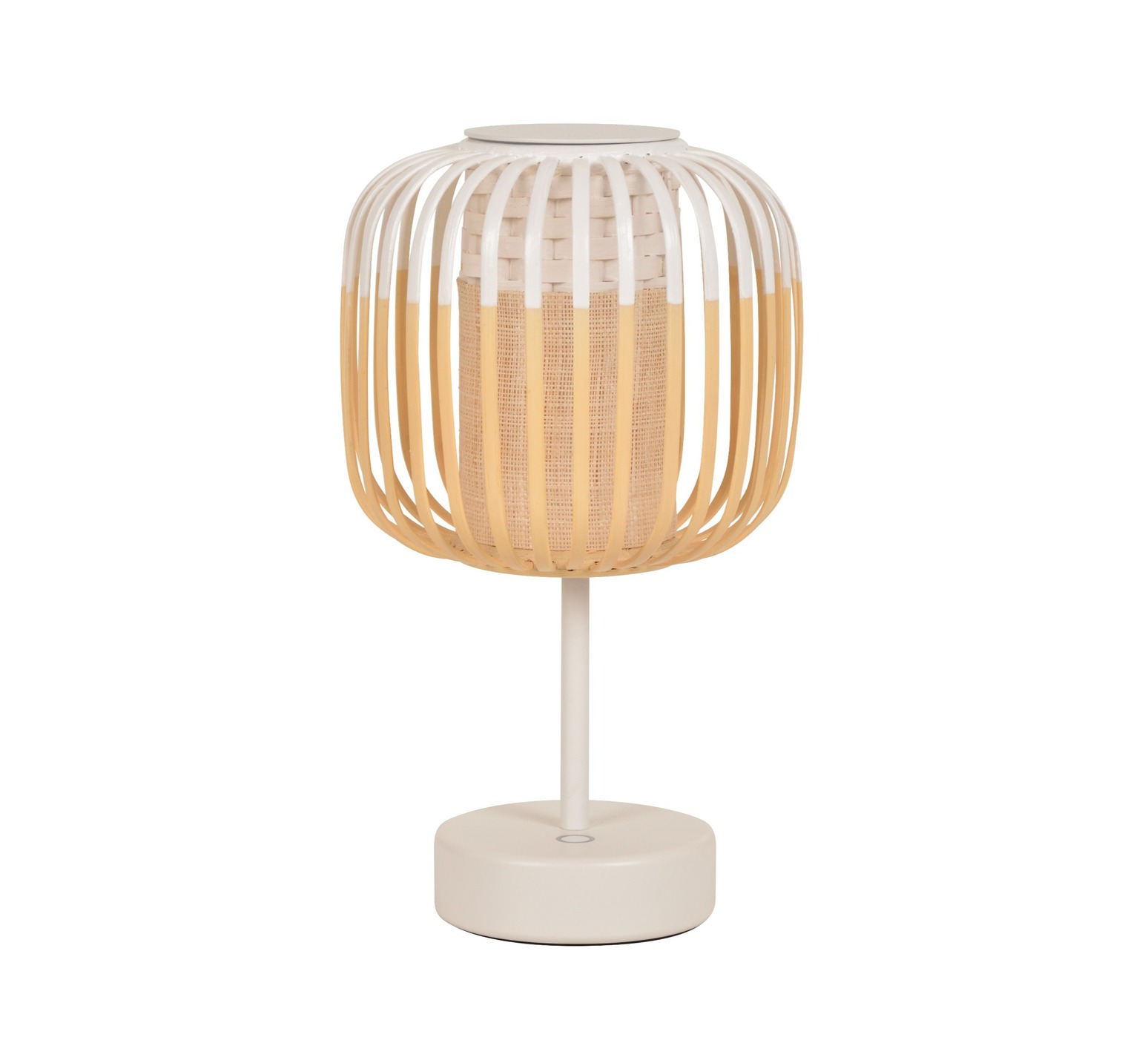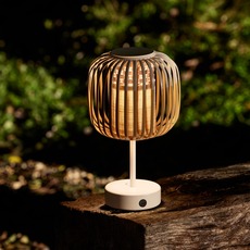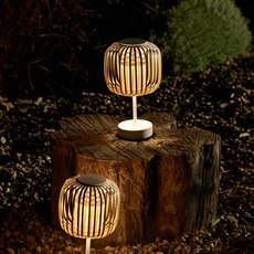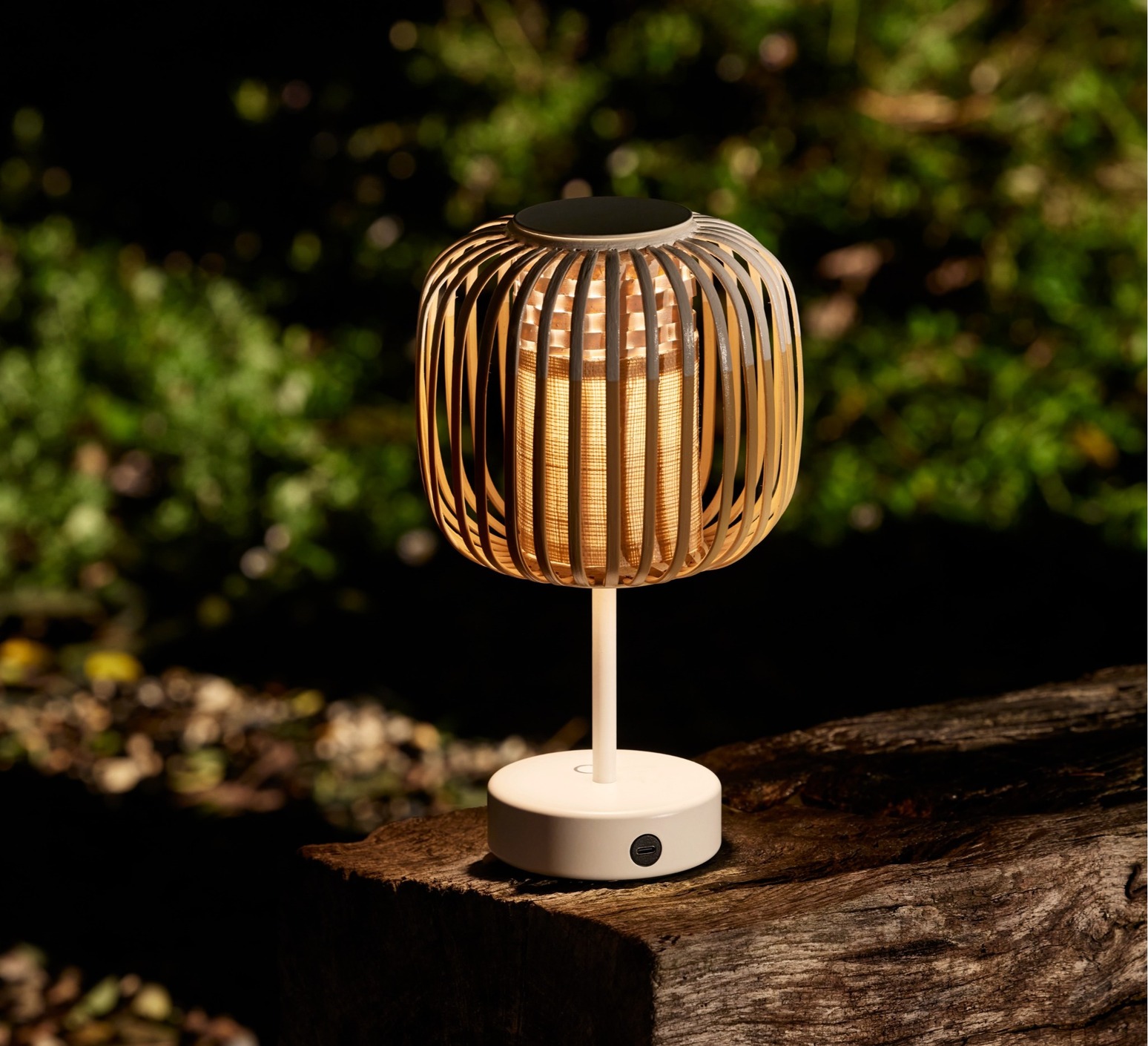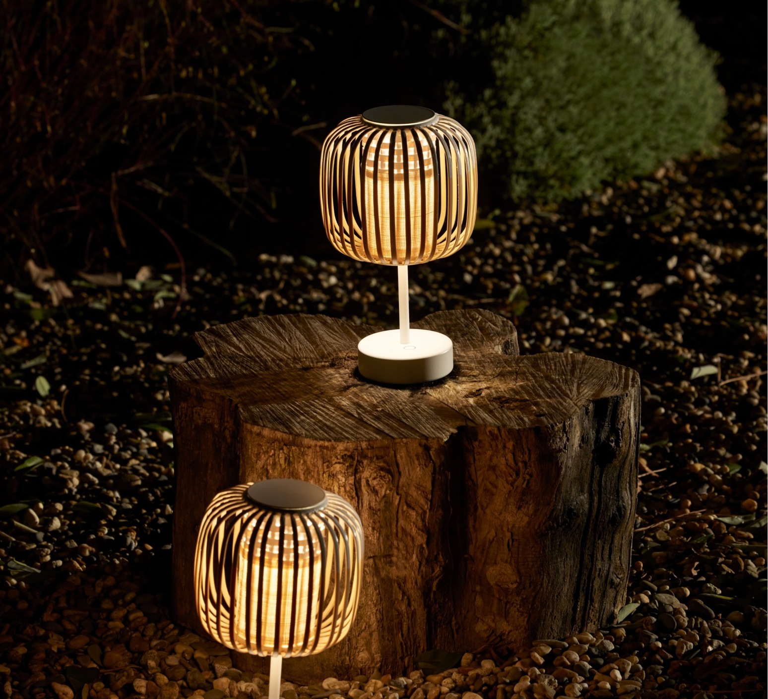 Die speziell für den Außenbereich konzipierte Mini-Version besteht aus zu einem Zylinder geflochtenen Bambuslamellen, die nach dem Einschalten ein subtiles Spiel aus Licht und Schatten erzeugen. Die Lampe ist kabellos und leicht zu transportieren. Sie erinnert an Freiheit und Leichtigkeit, getreu den Inspirationen von Forestier.