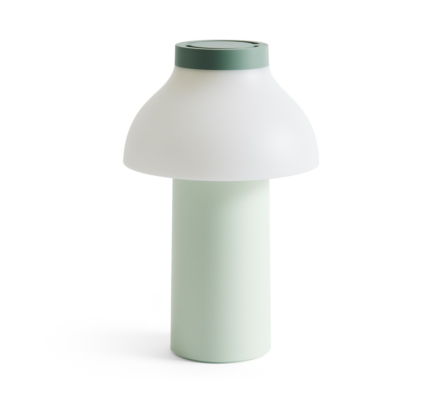 Entdecken Sie die tragbare PC-Handleuchte in heller Mintversion, die von Pierre Charpin für das skandinavische Haus Hay entworfen wurde.
