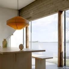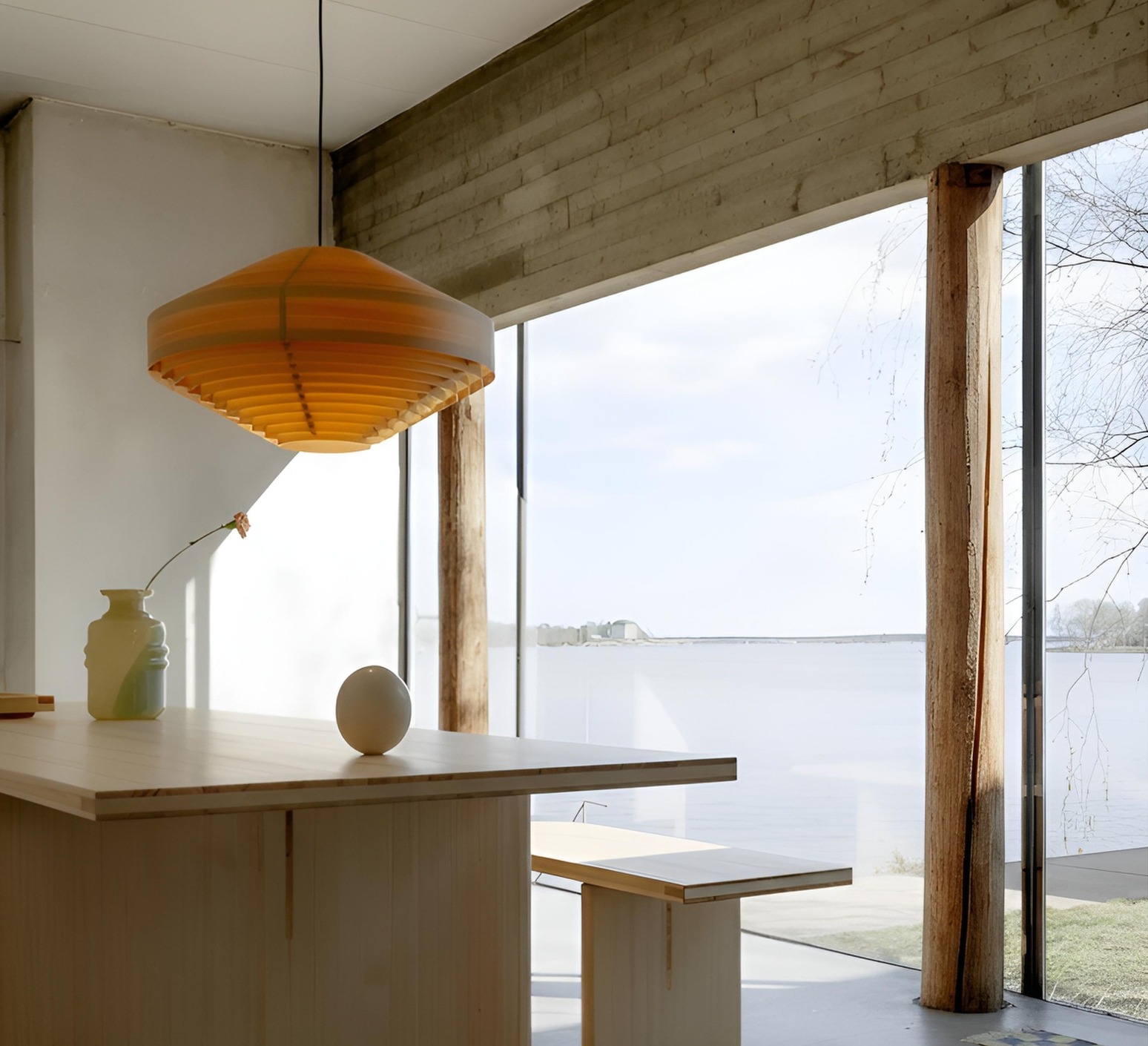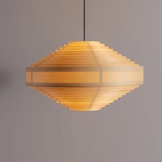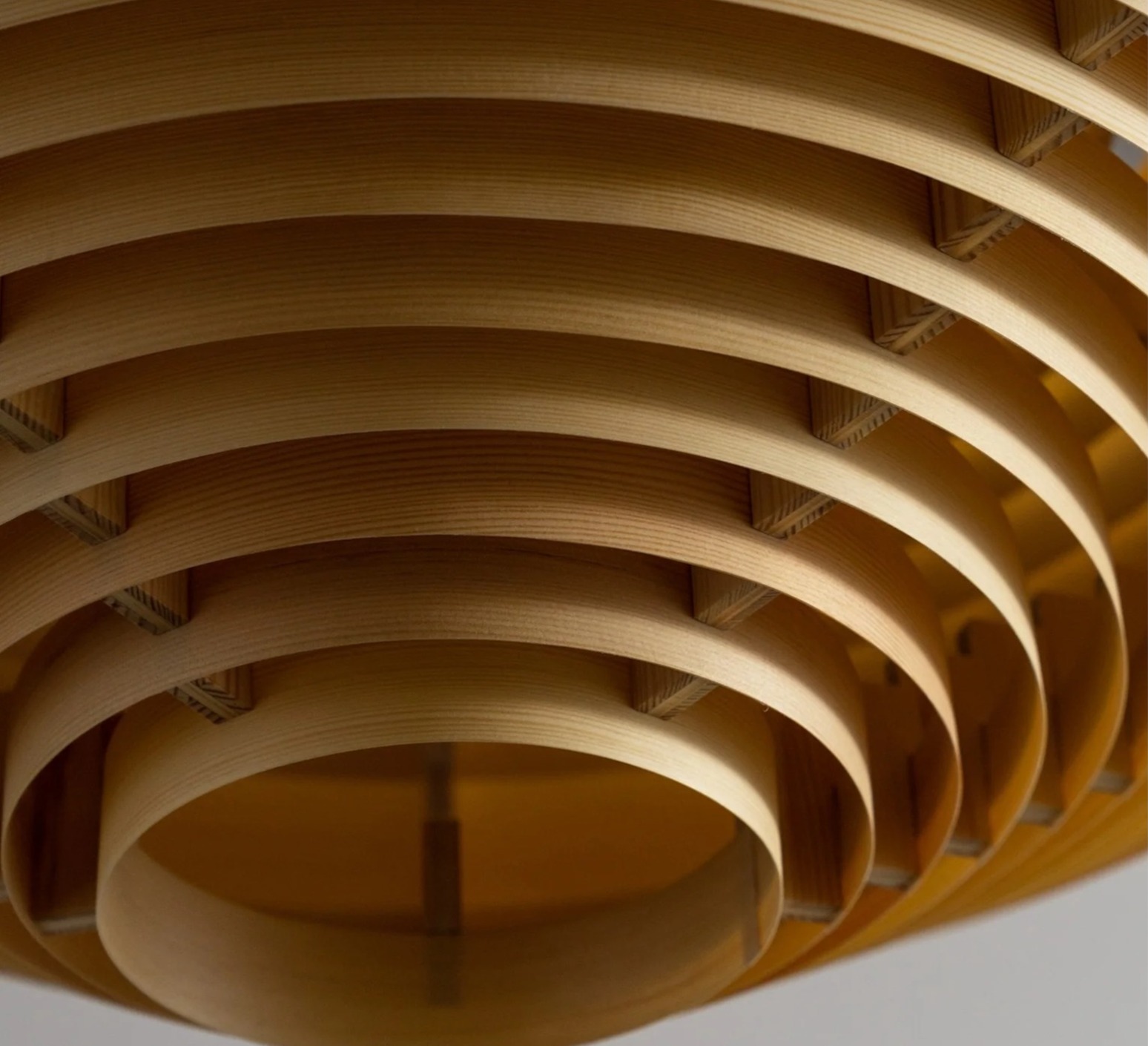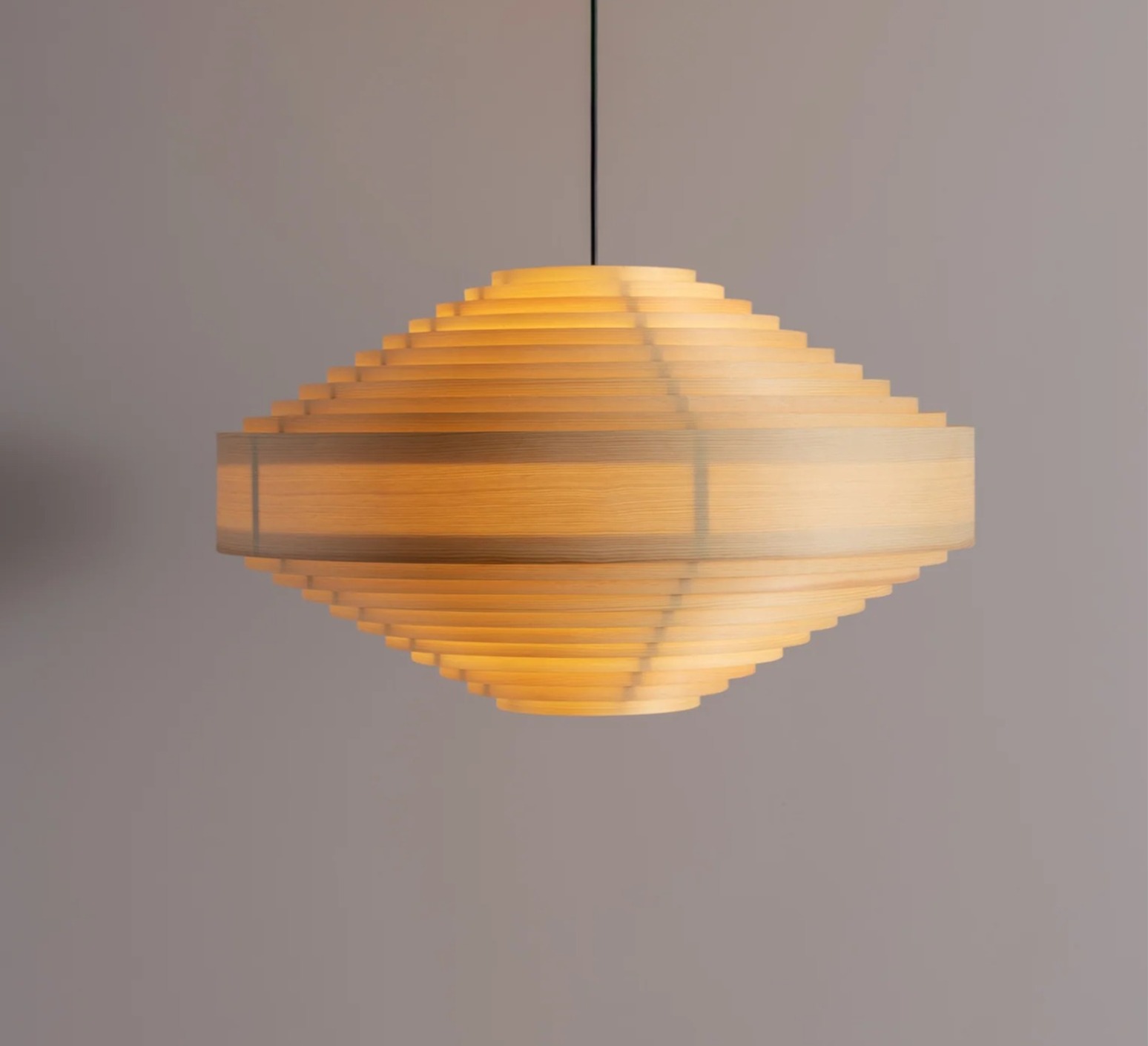Wenn das Licht durch die Holzstreifen austritt, entsteht ein sanfter, honigfarbener Schimmer, der die Maserung hervorhebt und sowohl an die Tradition des nordischen Designs als auch an eine zeitlose organische Modernität erinnert.