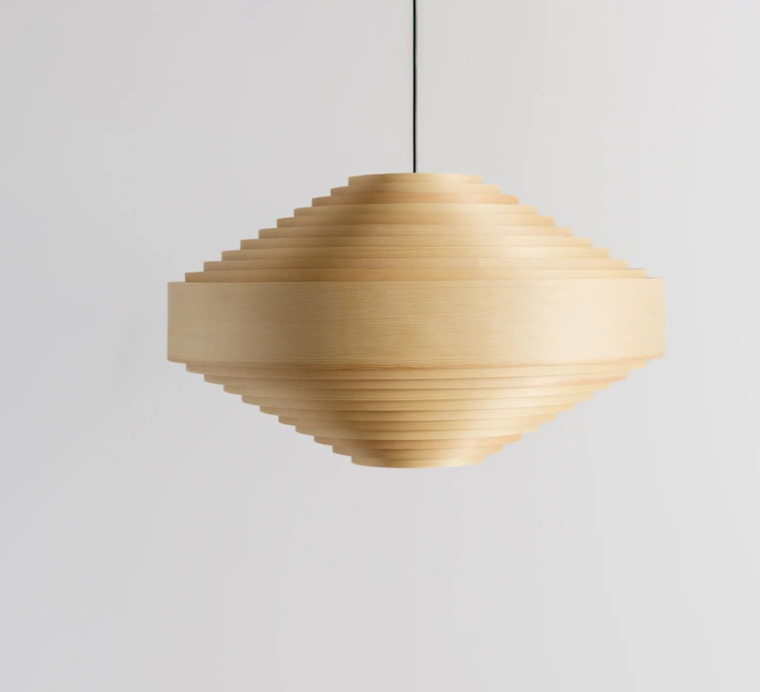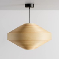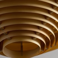 Dieses Stück interpretiert die typische grafische Kegelform des Designers neu, indem es sorgfältig verarbeitetes, natürliches finnisches Kiefernholz verwendet, das dem Lampenschirm eine warme, organische Präsenz verleiht.