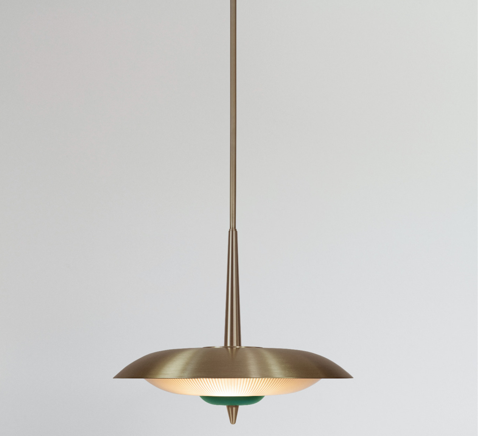 Ihr raffiniertes Design und die edlen Materialien wie Messing und Glas verleihen ihr ein zeitloses Aussehen. Ihr grünes Zentrum zieht die Blicke auf sich und setzt einen subtilen Farbakzent. Diese Hängeleuchte wird Ihr Zuhause erhellen und ihm gleichzeitig einen Hauch von Raffinesse verleihen.