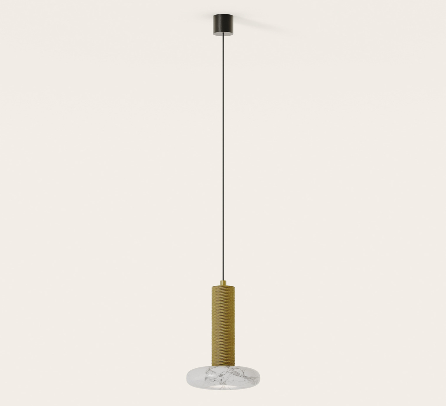 Ihre zylindrische Struktur aus Metall mit Altmessing-Finish steht im Dialog mit einer unteren Scheibe aus weißem Marmor, wodurch ein grafischer und raffinierter Kontrast zwischen metallischer Wärme und leuchtender Mineralität entsteht. Mit einem Durchmesser von 18 cm und einer Höhe von 25 cm passt er sowohl über einen Tisch, eine Insel oder in eine Mehrfachkomposition, wo sein klares, vertikales Design den Raum elegant strukturiert.