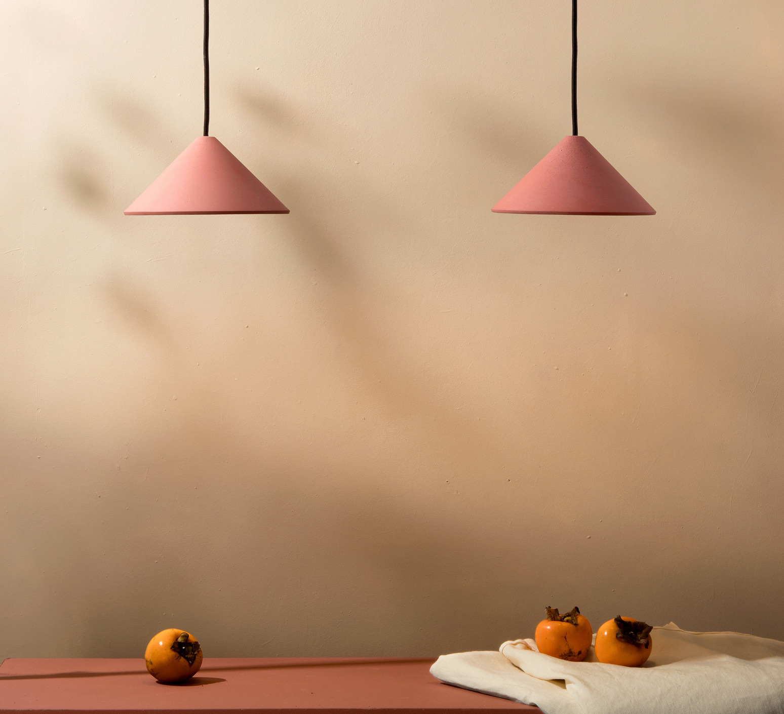 Diese in Italien handgefertigte Hängeleuchte aus farbigem Beton zeichnet sich durch ihr lachsfarbenes Finish aus, das subtil und warm wirkt und ideal ist, um einem modernen Interieur einen eleganten dekorativen Touch zu verleihen.