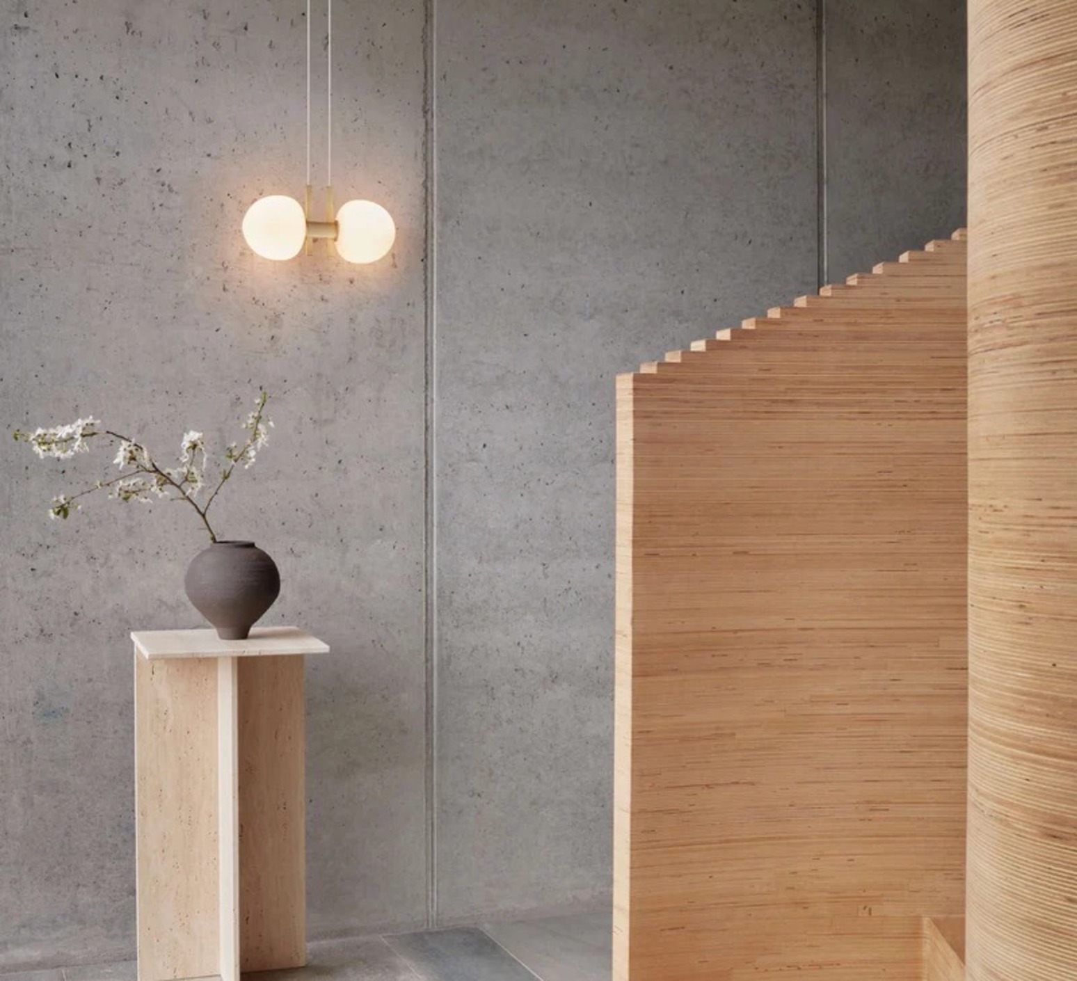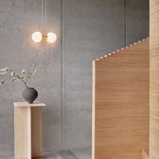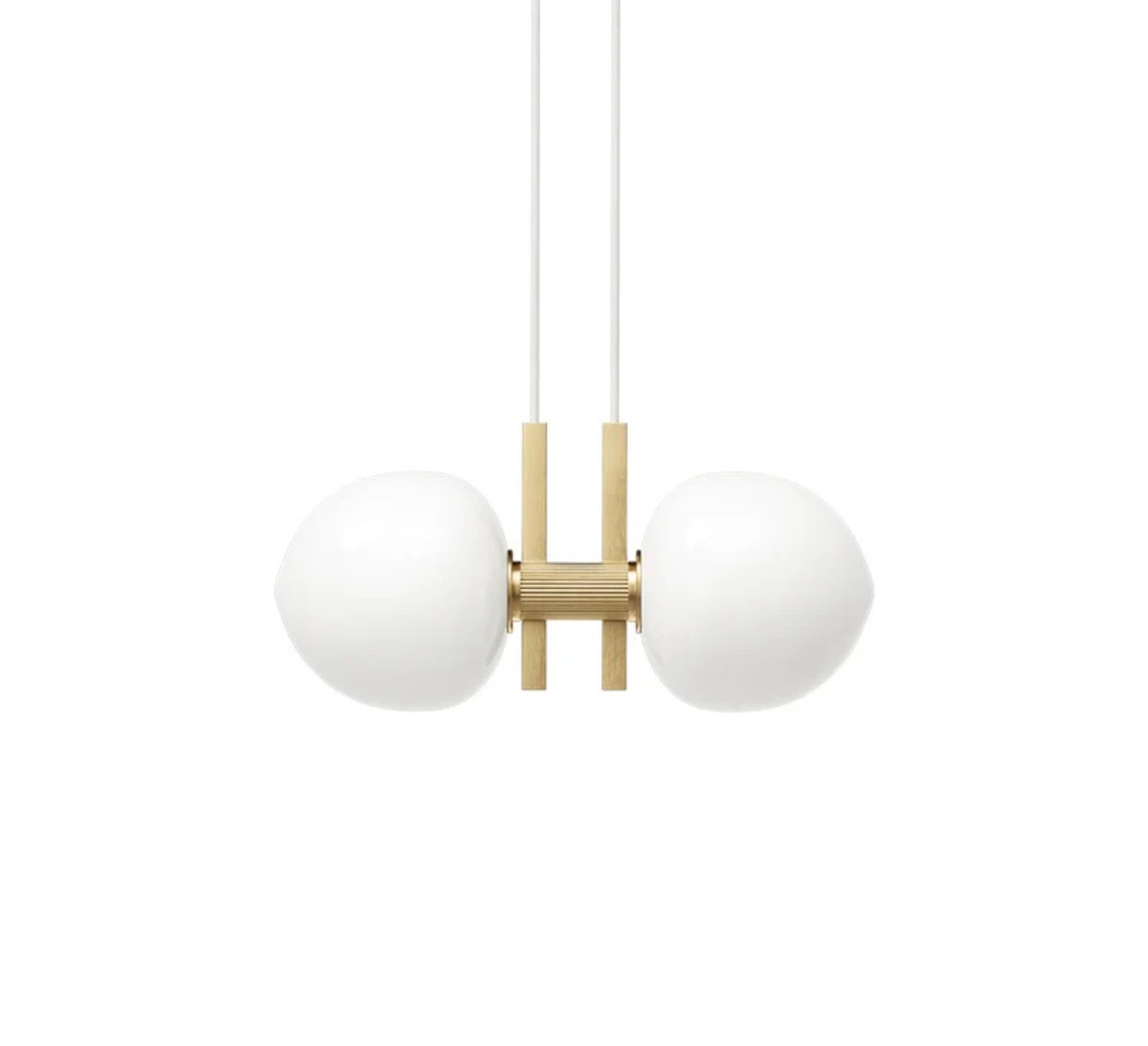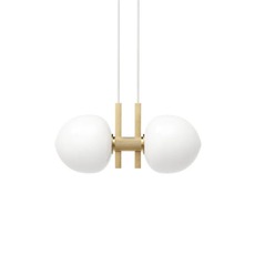 Diese Kreation ist eine zeitgenössische Interpretation des klassischen Kronleuchters, wobei der skandinavische Geist, der der Marke eigen ist, beibehalten wird. Mit seinen beiden Diffusoren aus Opalglas und der Struktur aus messingfarbenem, eloxiertem Aluminium verdeutlicht er die Absicht des Studios: eine historische Typologie neu zu beleben und gleichzeitig den Wert der Erinnerung in einer modernen, grafischen Sprache zu stärken.