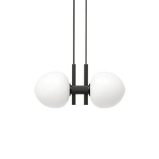 Diese Kreation ist eine zeitgenössische Interpretation des klassischen Kronleuchters, wobei der skandinavische Geist, der der Marke eigen ist, beibehalten wird. Mit seinen beiden Diffusoren aus Opalglas und der Struktur aus schwarz eloxiertem Aluminium verdeutlicht er die Absicht des Studios: eine historische Typologie neu zu beleben und gleichzeitig den Wert der Erinnerung in einer modernen, grafischen Sprache zu stärken.