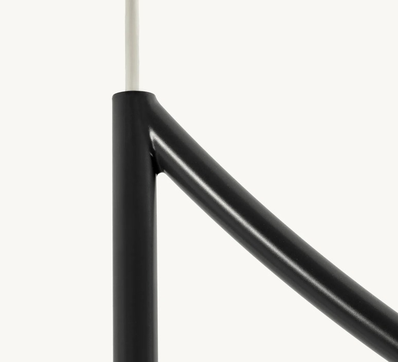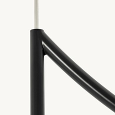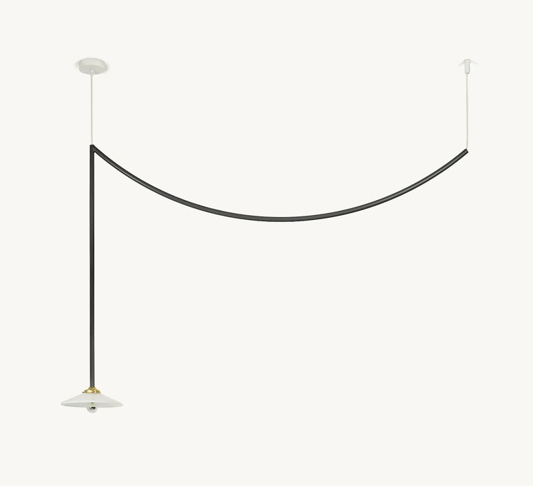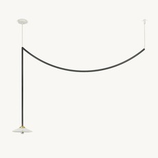 Das Design dieser Lampe ist von einer fast naiven Einfachheit, und doch füllen die Linien, aus denen sie besteht, den Raum auf spielerische und farbenfrohe Weise. Die Hängeleuchte N°4 besteht aus einem gebogenen Messingstahlrohr und einem weißen Lampenschirm mit einem Durchmesser von 25 cm, der laut Hannes Van Severen "eine fantastische Form hat: vollkommen neutral". Dieses Rohr ist an zwei Stellen mit Kabeln verbunden, um ihm seine Wellenform zu verleihen und es aufzuhängen.