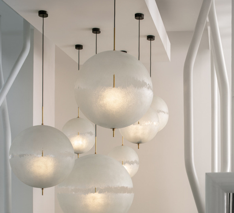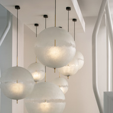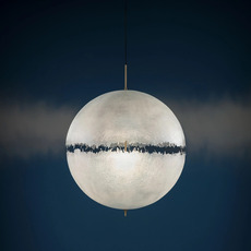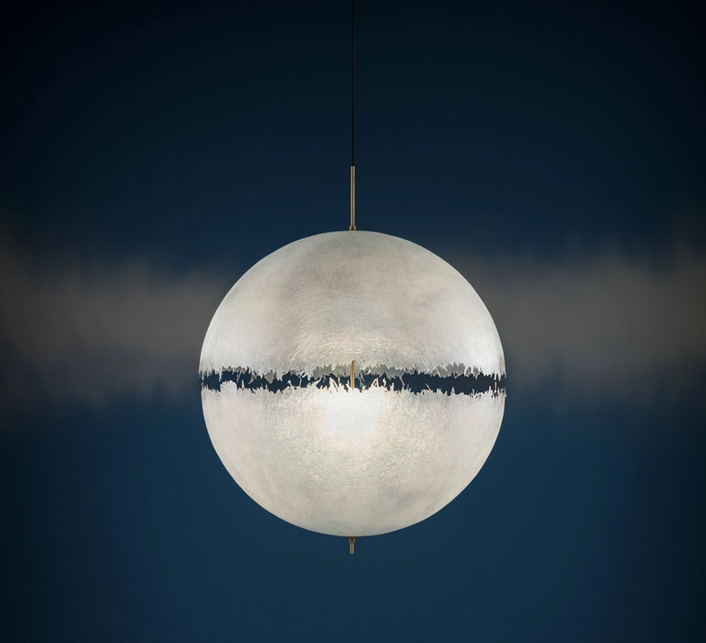 Mit ihrer Kugelform und dem Diffusor aus Glasfaser und ausgefransten Kanten wirft die Hängeleuchte PostKrisi 66 ein Spiel aus Schatten und Kontrasten, das den Raum belebt. Über einem Tisch oder in einem Wohnzimmer aufgehängt, wird sie zu einem zentralen Element der Innendekoration. Einzeln oder in einer Komposition verwendet, schafft sie eine grafische und poetische Atmosphäre und sorgt gleichzeitig für eine umhüllende Beleuchtung.