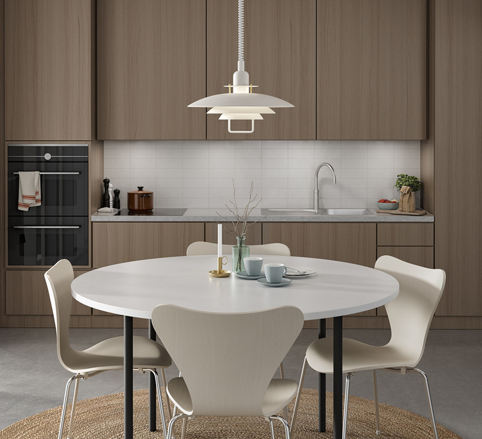 Der Primus II bietet eine minimalistische, kreisförmige Silhouette, die die skandinavische Eleganz widerspiegelt. Mit einem Durchmesser von 43 cm und einer Höhe von 24,9 cm sorgt sie für ein angenehmes, diffuses Licht und fügt sich dabei unauffällig in ihre Umgebung ein. Sie lässt sich leicht mit anderen Pendelleuchten der Kollektion kombinieren, um in einer Küche oder einem Cafébereich eine leuchtende Harmonie zu schaffen. Diese Hängeleuchte ist dank eines Metallgriffs in der Höhe verstellbar.