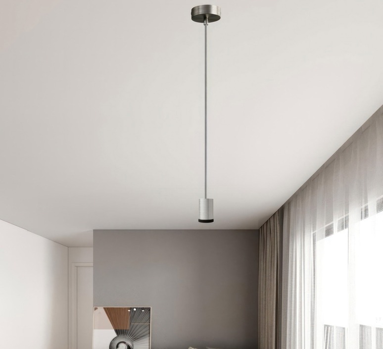 Dieses Modell ist mit einer GU10-Fassung für die mitgelieferte MINI GU10 (MR11) Glühbirne ausgestattet, die eine direkte Beleuchtung mit 2700 K und 260 Lumen bietet. Die Lampe ist nicht dimmbar. Gehäuse aus satiniertem Titanmetall, 1,3 m langes Textilkabel in glänzendem Kohleschwarz (RM04), passende Mini-Rosette Ø8,3 cm. Abmessungen des Spots: Ø4,2cm × H7,6cm. Die Installation ist fest installiert. Achtung: Standard-GU10-Glühbirnen sind mit diesem System nicht kompatibel.