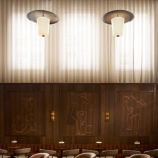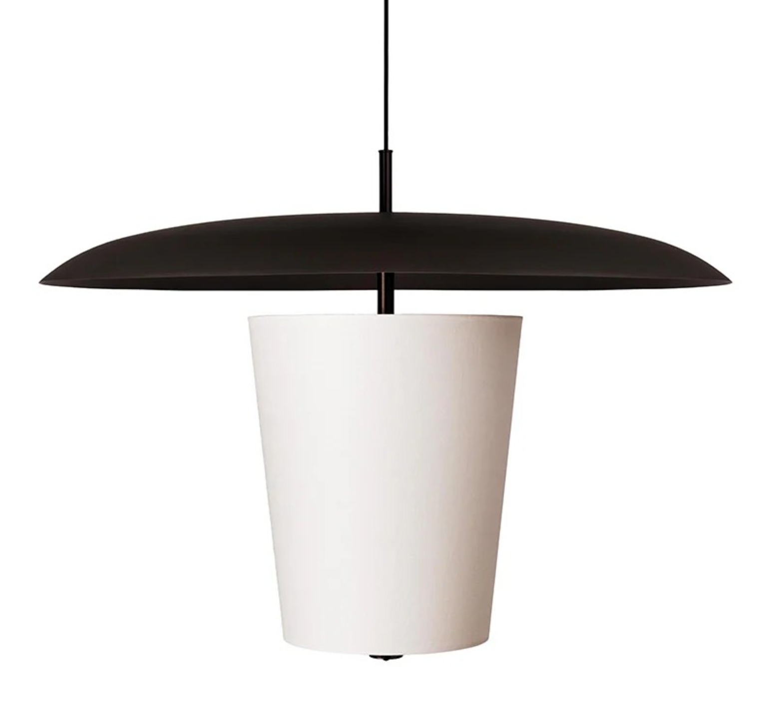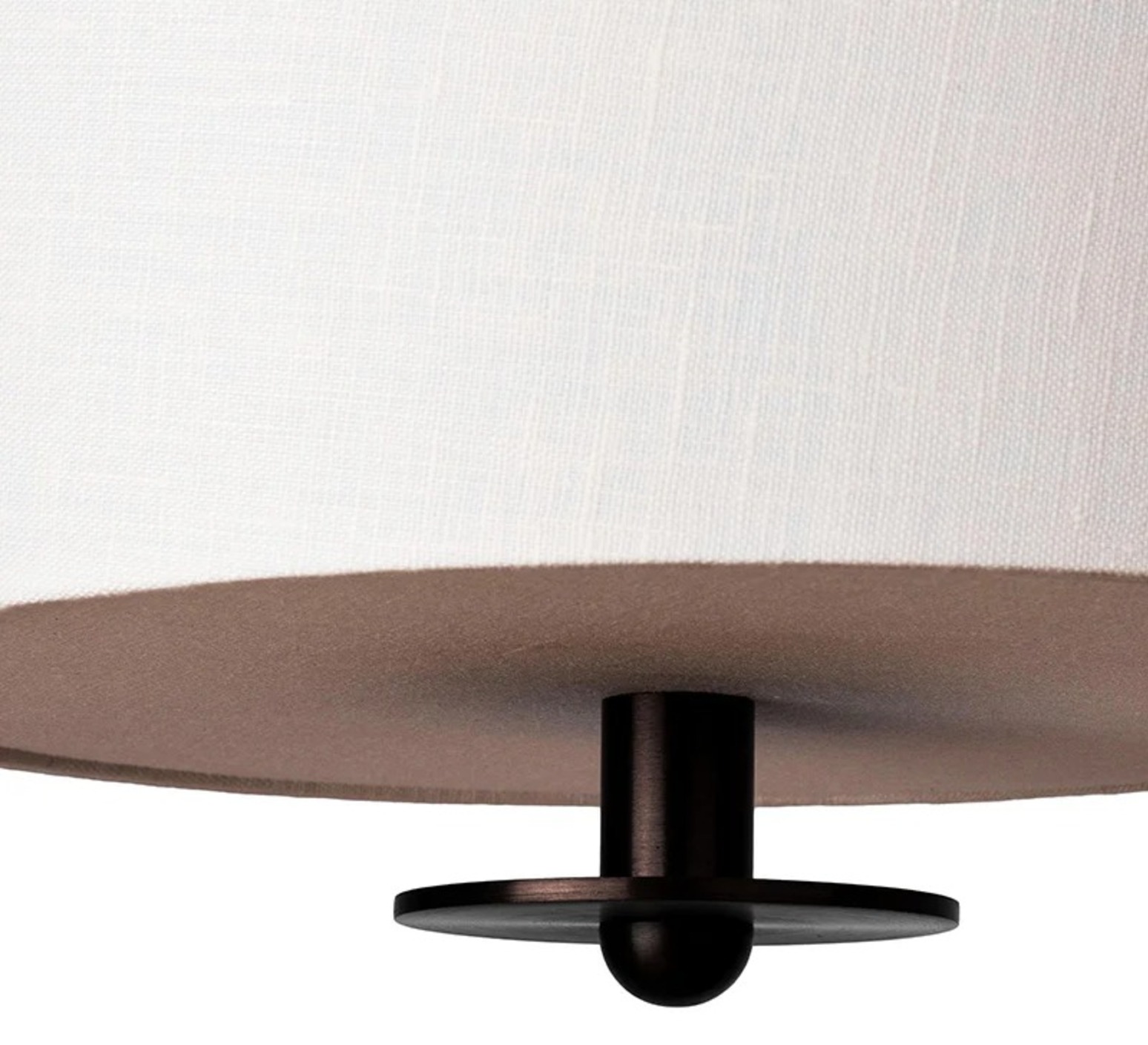 Ihre Ästhetik ist von der Idee inspiriert, Musikalität in Licht zu verwandeln: Rhythmus, Harmonie und Präsenz werden in eine großzügige und ausgewogene Silhouette übersetzt. Die große obere Metalllinse verbreitet ein weiches, gleichmäßiges Licht, während der untere Textilteil die Atmosphäre durch eine subtile Wiedergabe bereichert. Diese Kombination schafft eine umhüllende Atmosphäre, ideal über einem großen Tisch, in einer Lobby oder im Zentrum eines großen Raumes. Das Bronzedetail im Herzen der Komposition sorgt für einen warmen, zeitgemäßen Touch und erinnert sowohl an das moderne als auch an das elegante Design der 1930er Jahre.