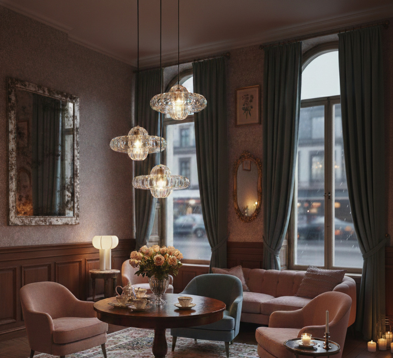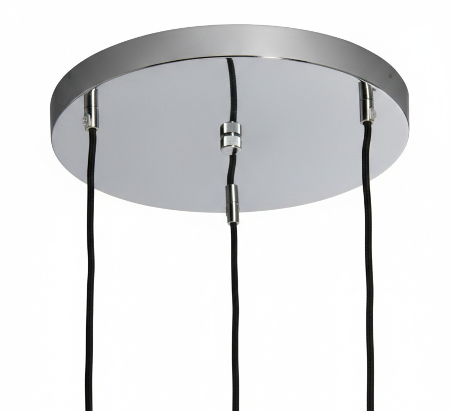 Diese dekorative Hängeleuchte mit drei Lampenschirmen passt zu zeitgenössischen Einrichtungen.