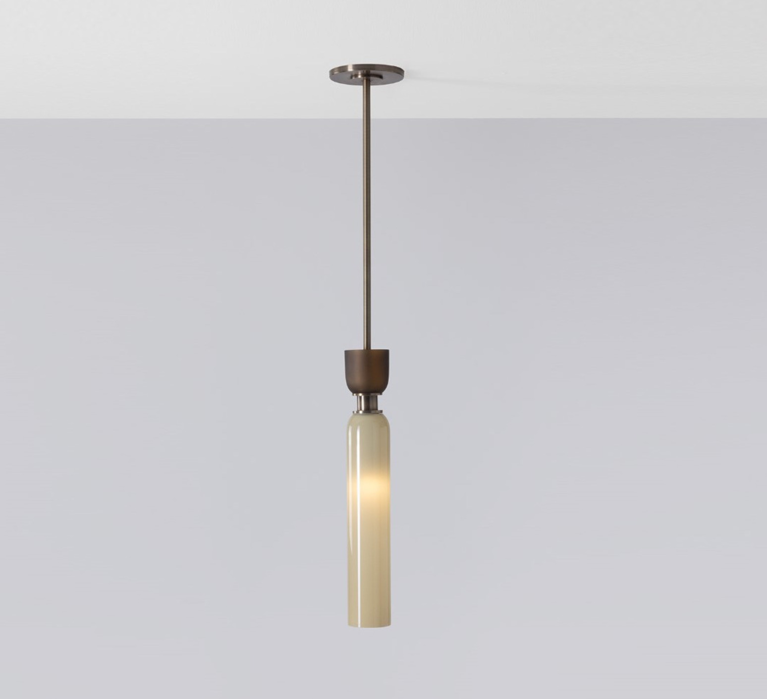 Ihr zylindrisches Design kombiniert eine längliche untere Kuppel aus hellbeigem Milchglas mit einer kompakteren oberen Kuppel aus gefrostetem Olivinglas. Getrennt durch ein zentrales Messingelement mit klassischen Details, schaffen diese Volumen einen subtilen Kontrast zwischen Material, Transparenz und Textur. Die Union Small Pendelleuchte fügt sich elegant über einem Tisch, einer Insel oder in einer Mehrfachkomposition ein, um den Raum auf feine Weise zu strukturieren.