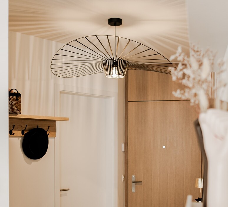 Die Leuchte wurde aus Glasfaser, Stahl und Polyurethanbändern gefertigt. Die Fassung und die Rosette werden mitgeliefert, was bei der Glühbirne nicht der Fall ist. Es wird empfohlen, eine E27-LED-Glühbirne mit einer maximalen Leistung von 7 W zu verwenden. Sie hat einen Durchmesser von 140 cm und eine Höhe von 15 cm. Treiber nicht erforderlich. Nicht dimmbar. Verstellbares 3-m-Kabel.