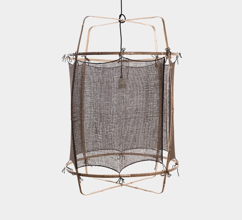 Die Hängeleuchte Z1 von Ay Illuminate ist eine handgefertigte Leuchte, die schwarzen Bambus mit handgefertigten Textilien aus Seide und Kaschmir verbindet.
