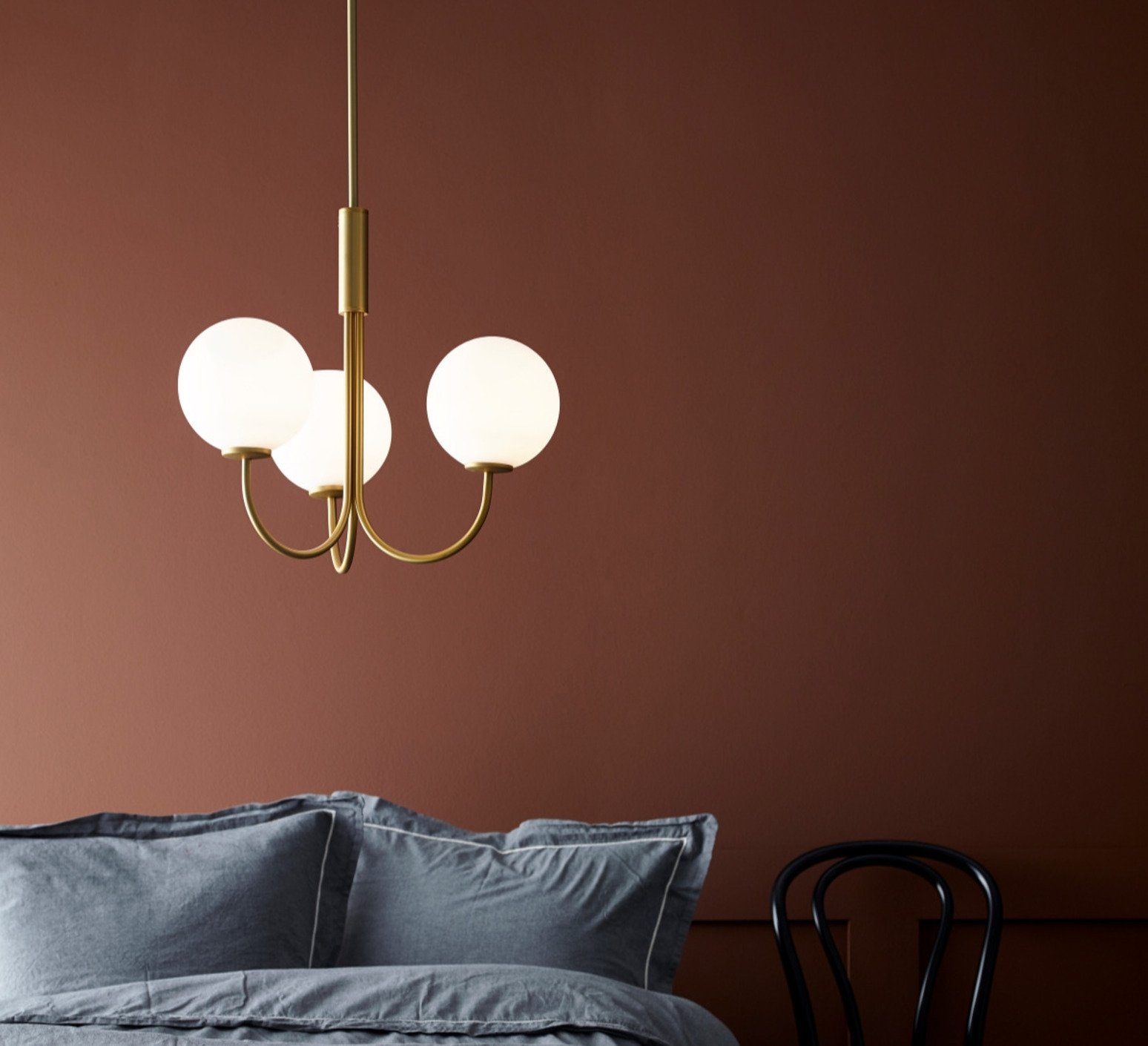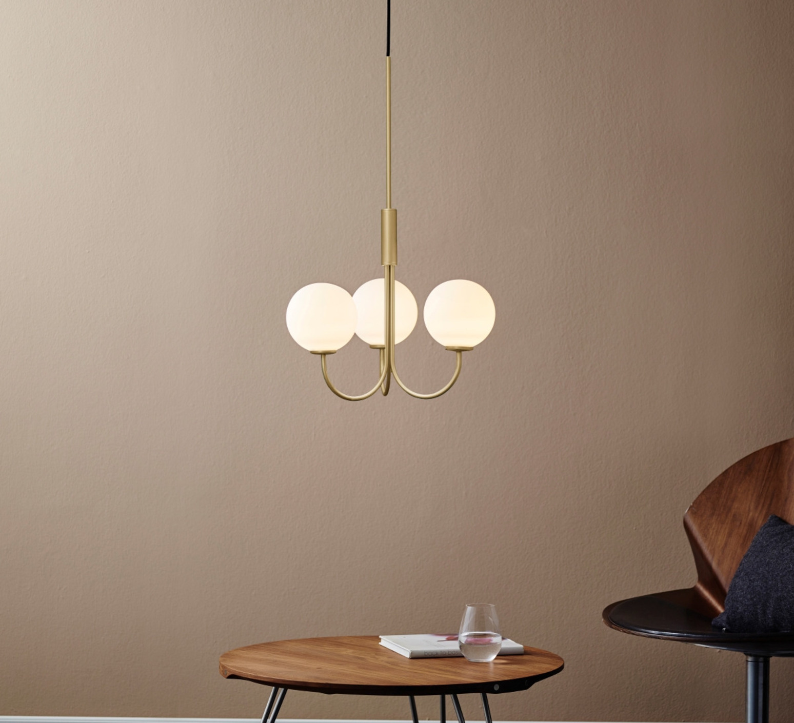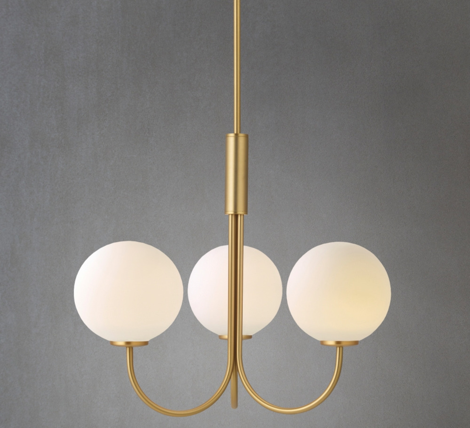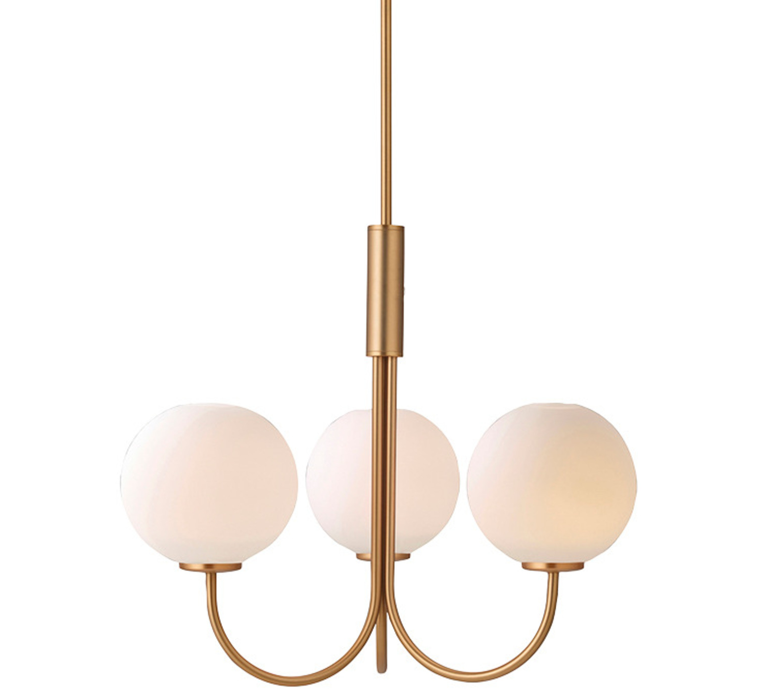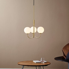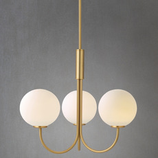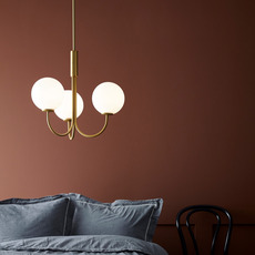 Seine drei kugelförmigen Diffusoren aus weißem Glas bilden einen harmonischen Kontrast zum messingfarbenen Gestell und schaffen ein subtiles und raffiniertes Spiel der Materialien. Diese Schwarz-Weiß-Kombination hebt die Reinheit der Formen hervor und passt zu allen Einrichtungsstilen, vom nordischen Minimalismus bis hin zu zeitgenössischeren Umgebungen.