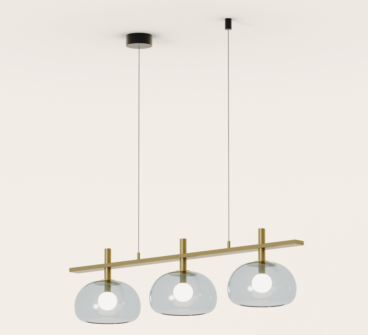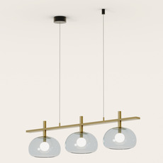 Der Kronleuchter Cloud zeichnet sich durch eine ausgewogene Komposition aus drei kugelförmigen Glaskugeln aus, die sanft an einer horizontalen Stange aus altgoldfarbenem Metall aufgehängt sind. Das Ensemble vermittelt eine luftige und grafische Eleganz, die eine Kücheninsel, einen Esstisch oder einen Empfangsbereich veredelt. Seine skulpturale Präsenz, die zugleich raffiniert und zeitgemäß ist, verleiht dem Raum eine wertvolle Note, ohne ihn zu beschweren, und strukturiert den Raum auf sanfte und raffinierte Weise.