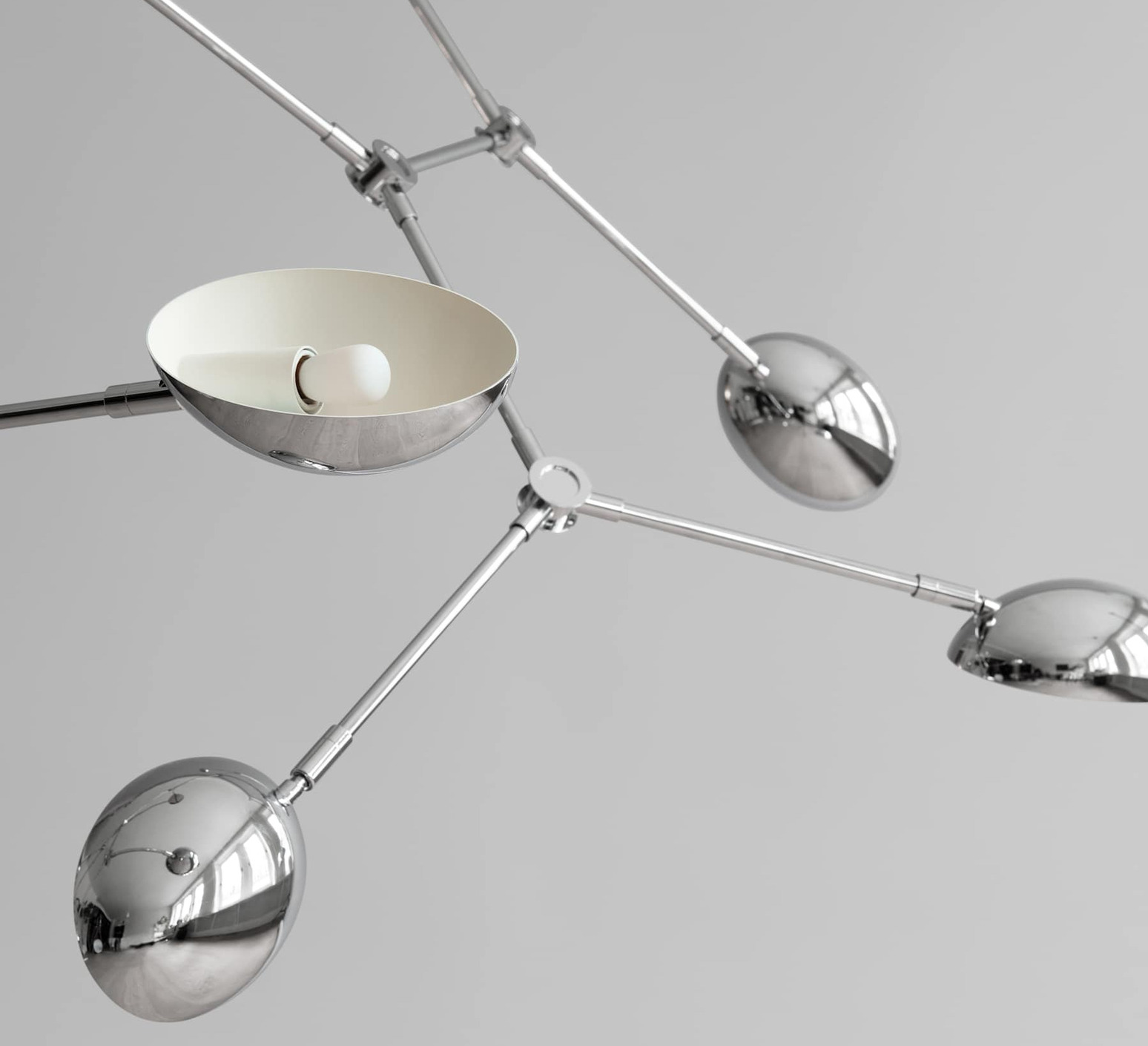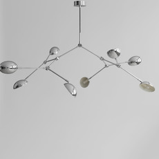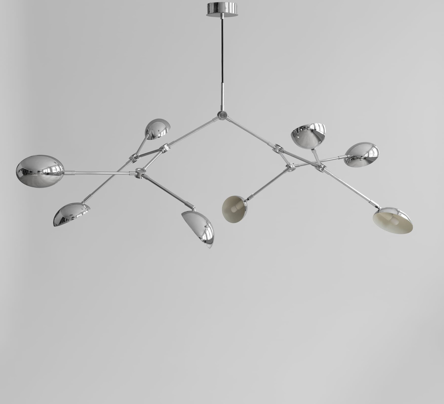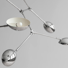 Ihre fließende Struktur aus verchromtem Aluminium besteht aus 14 flexiblen, verstellbaren Armen, die jeweils von einem leicht gebogenen Lampenschirm gekrönt werden, wodurch ein dynamisches Spiel aus Licht und Schatten entsteht. Die spiegelnde Chromoberfläche reflektiert die Umgebung und unterstreicht den skulpturalen Effekt. Drop kann über einem Esstisch, in einem Wohnzimmer oder einem Flur mit hohen Decken, einzeln oder in einer Komposition aufgehängt werden, um den Raum zu rhythmisieren und aufzuwerten.