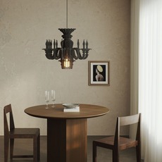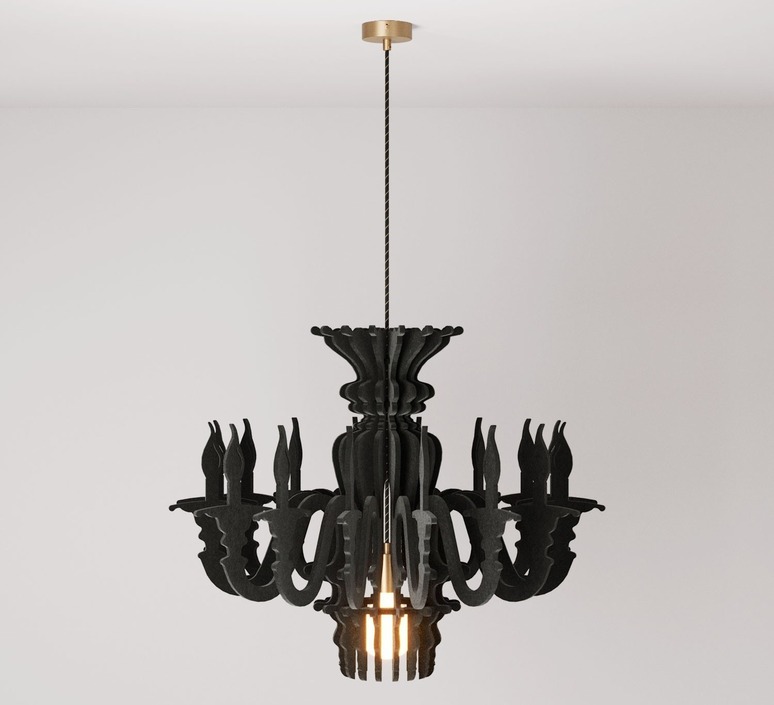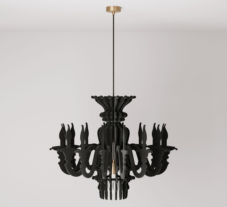 Die in Italien entworfene und hergestellte Leuchte lässt den Geist der traditionellen venezianischen Kronleuchter durch ein zeitgemäßes und verantwortungsbewusstes Design wieder aufleben, indem sie innovative Materialien und grafische Ästhetik miteinander verbindet.
