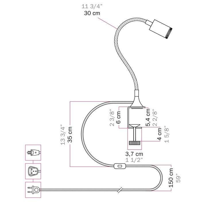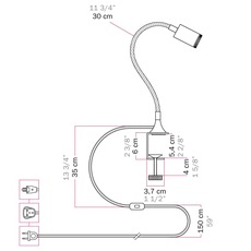 Die Lampe ist mit einer GU10-Fassung ausgestattet (Glühbirne nicht im Lieferumfang enthalten, nur für MINI GU10/MR11 geeignet), die ein direktes, ausrichtbares Licht bietet. Sie verfügt über ein 2 m langes, optisch weißes, glänzendes Kabel mit einem zweipoligen Schalter und einem EU-Stecker. Gesamtlänge 40 cm, Durchmesser 4 cm, nicht dimmbar.