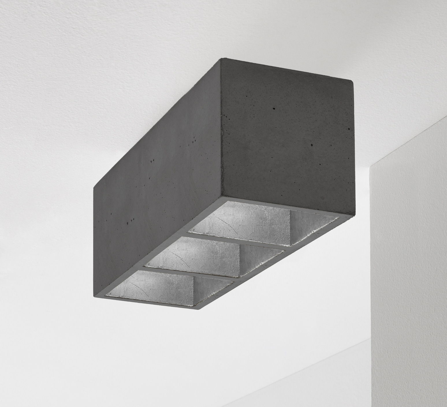 Ihr kubisches Design aus dunkelgrauem Beton wird subtil durch ein silbernes Innenleben aufgewertet, wodurch ein eleganter und warmer Kontrast entsteht. Das raue Aussehen des Betons in Verbindung mit dem silbernen Schimmer verleiht dem Spot [B7]³ eine zeitgemäße und natürliche Präsenz. Er fügt sich harmonisch in ein Wohnzimmer, einen Flur oder eine Küche ein, als Einzelinstallation für einen dekorativen Akzent oder in einer Reihe, um den Raum visuell zu strukturieren.