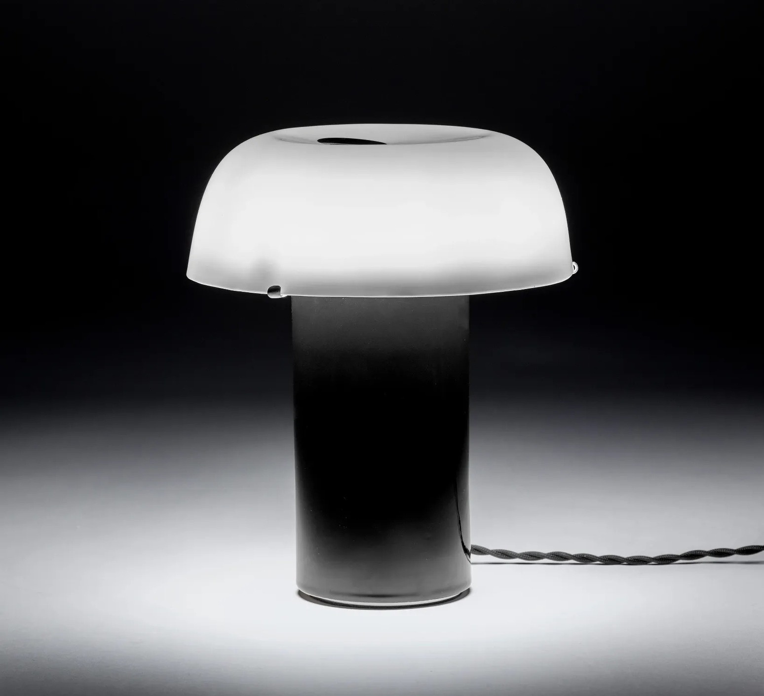 Das Design ist von klaren Formen und natürlichen Materialien inspiriert, und die Hinzufügung eines schwarzen Punktes am oberen Ende des Lampenschirms verleiht der Lampe einen skulpturalen und raffinierten Touch.