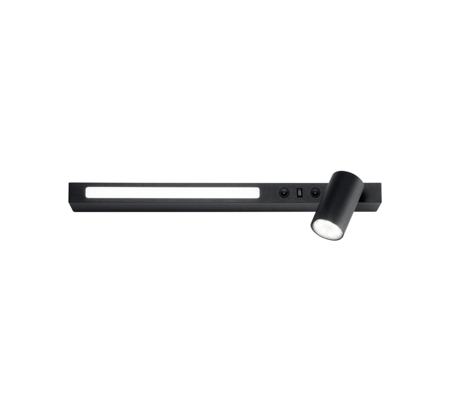 Ihr Körper aus schwarzem Metall mit seinen langgezogenen Linien drückt minimalistische Eleganz aus. Dank des verstellbaren Spots können Sie das Licht je nach Bedarf auf eine Wand, ein Bild oder einen bestimmten Bereich im Raum richten. Der Lichtstreifen ermöglicht eine feste Beleuchtung.