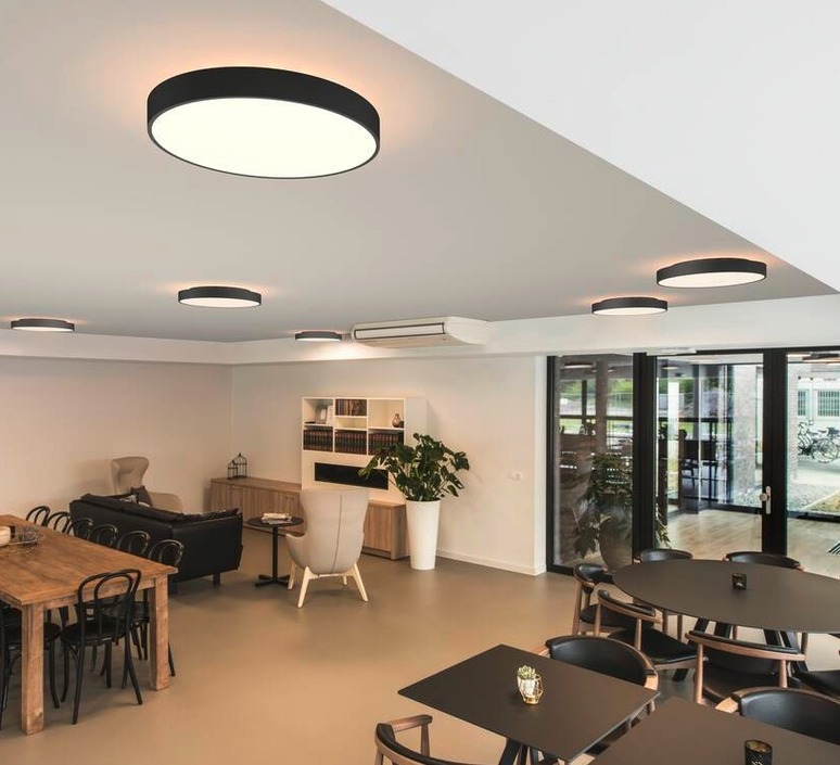 Die MEDO® PRO 60-Leuchte ist eine schwarze, bündige Aluminiumscheibe, die sowohl an der Decke als auch an der Wand angebracht werden kann.