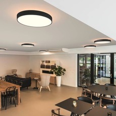 Diese Leuchte ist ideal für ein Wohnzimmer, ein Esszimmer, einen Flur oder einen Eingangsbereich, in dem ein starkes, aber gedämpftes Licht gewünscht wird. Als Deckenleuchte beleuchtet sie den Raum gleichmäßig, als Wandleuchte kann sie einen dekorativen Lichteffekt an der Wand erzeugen, indem sie nach oben und unten leuchtet, wenn der Diffusor dies zulässt. Da das Modell komplett schwarz ist, kann es in helle oder neutrale Innenräume integriert werden, ohne die Harmonie der Farbtöne zu stören.