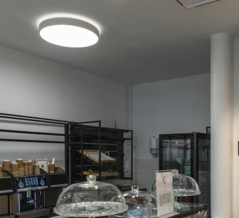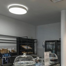 Die MEDO® PRO 60-Leuchte ist eine weiße, bündige Aluminiumscheibe, die sowohl an der Decke als auch an der Wand angebracht werden kann.