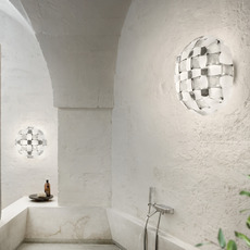Die Mida Large ist in den Ausführungen Weiß und Platinum erhältlich und verbreitet ein weiches 360°-Licht, das eine elegante und raffinierte Atmosphäre schafft. Die polierten Cabochons, die geometrisch über eine Blütenkrone verstreut sind, erinnern an den Glanz von farbigen und metallischen Edelsteinen.